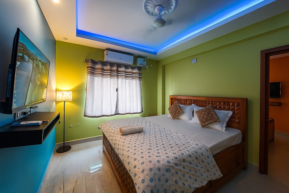 Experience peace, luxury and family-friendly comfort at our centrally located apartment near Puri Odisha Beach.The vibrant colours of the apartment is more beautiful than any hotel room in Puri. Experience a serene atmosphere, modern amenities, and easy access to local attractions. Perfect for a relaxing getaway, just steps from the beach and vibrant city life. This is a brand new apartment and is located near the beach area. Golden beach is at 800 m. Shree Jagannath temple is 2kms away.