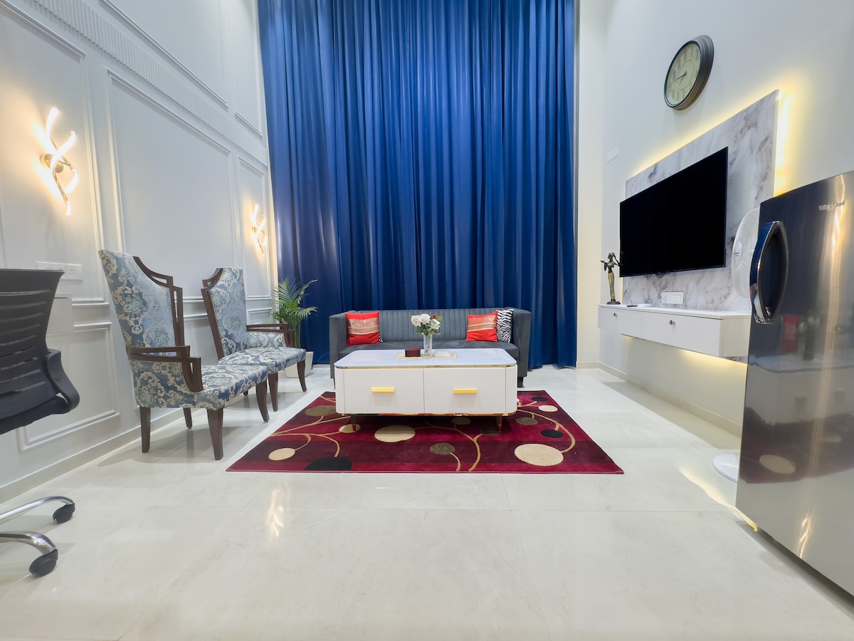 Welcome to our luxurious urban Studio, a sanctuary of style and sophistication in the vibrant heart of the Gurgaon. A standout feature of our loft is specialty Black color scheme, which adds a touch of elegance and drama to space, making your stay comfortable & stunning. As you step into our elegantly furnished Studio, you’ll be greeted by sight of our plush black recliners. These two luxurious recliners are the centerpiece, offering a perfect blend of contemporary design & exceptional comfort.