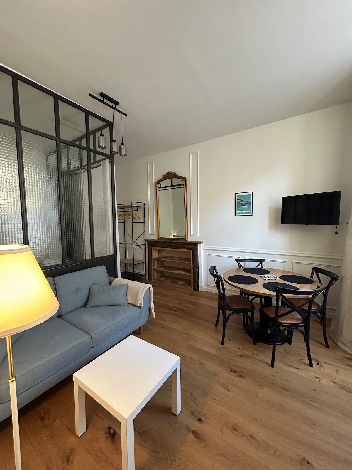 Au coeur de l'intra muros. Bel appartement confortable 44m², au 2ème étage d'un immeuble XVIIè. Vue imprenable sur jardin remarquable et toits de la ville. Situé au coeur du centre historique et des rues piétonnes, à proximité des boutiques, des halles, du marché, de la Cathédrale, des musées et du port de Vannes. Le logement comporte un grand séjour, une chambre cosy avec lit queen size de grande qualité, une vaste salle de bain et une cuisine équipée. Décoration soignée et chaleureuse.