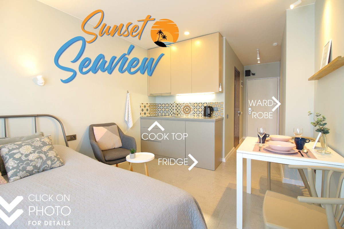 A compact, first-line apartment with a Sunset Seaview Balcony, perfectly located next to the beach (only 50 meters away). Dear Guests. Please check out the photo gallery; We have all necessary information listed there together with the images. • Perfect location • 50 Mbit High-speed internet & TV • Iron & washing machine • Towels, bed linen, liquid soap (no shampoo, slippers) • Electric oil heater, Air conditioner (with a heating/cooling mode) • Equipped kitchen (no spices) • 24/7 Reception