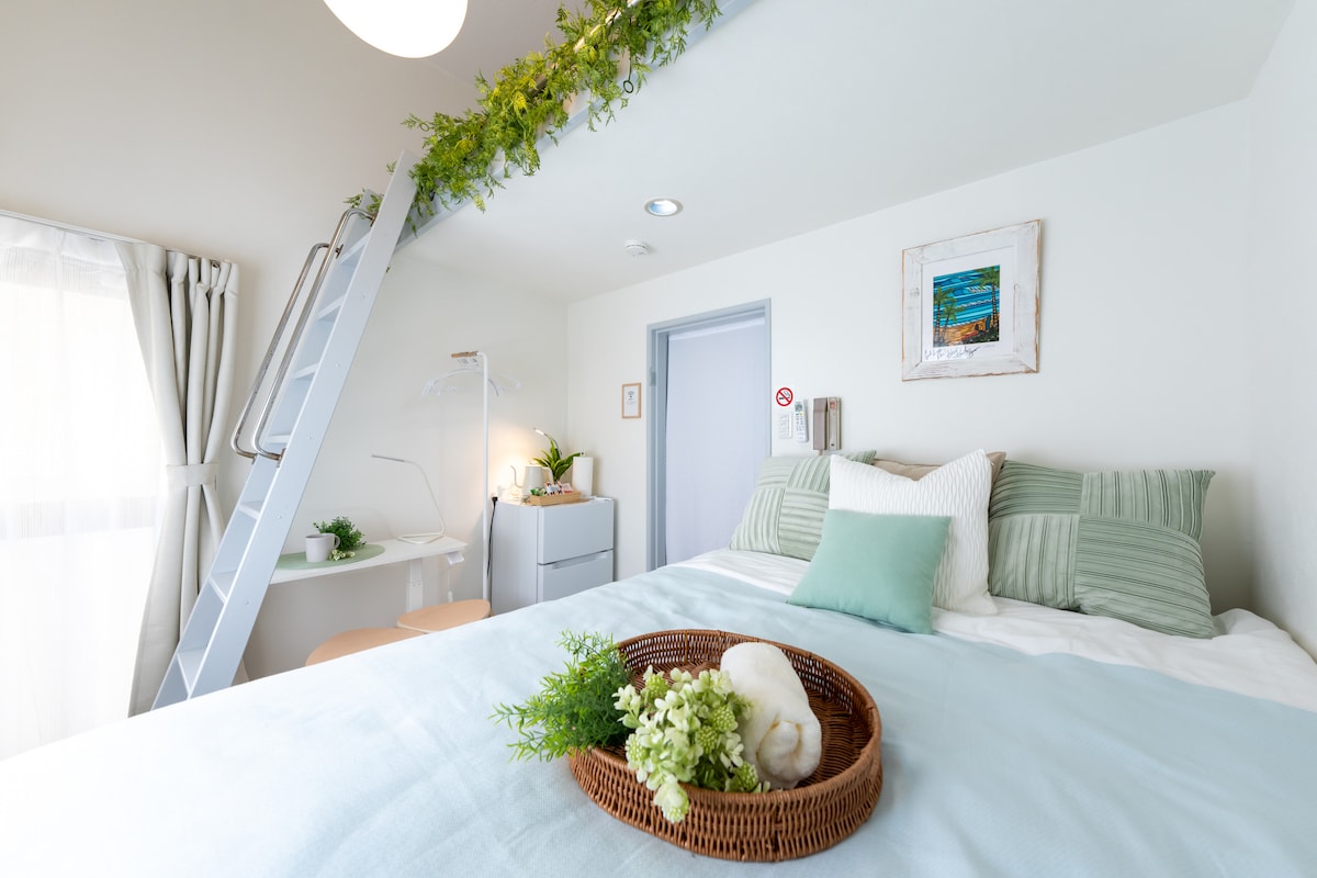 Peaceful stay one street off Meiji-dori’s cherry blossom avenue, with sakura-view cafés and restaurants 1–2 min away. Near the embassy district, Tokyo’s safest area, with English-friendly cafés and supermarkets. Morning: bakery 1 min away or breakfast café 5 min away. Night: Ebisu Yokocho, hidden bars, and diverse restaurants. Loved by Big Tech developers and digital nomads; the loft’s two doubles let even tall guests sleep lengthwise. 1 stop to Shibuya or Roppongi, tucked away for quiet work.