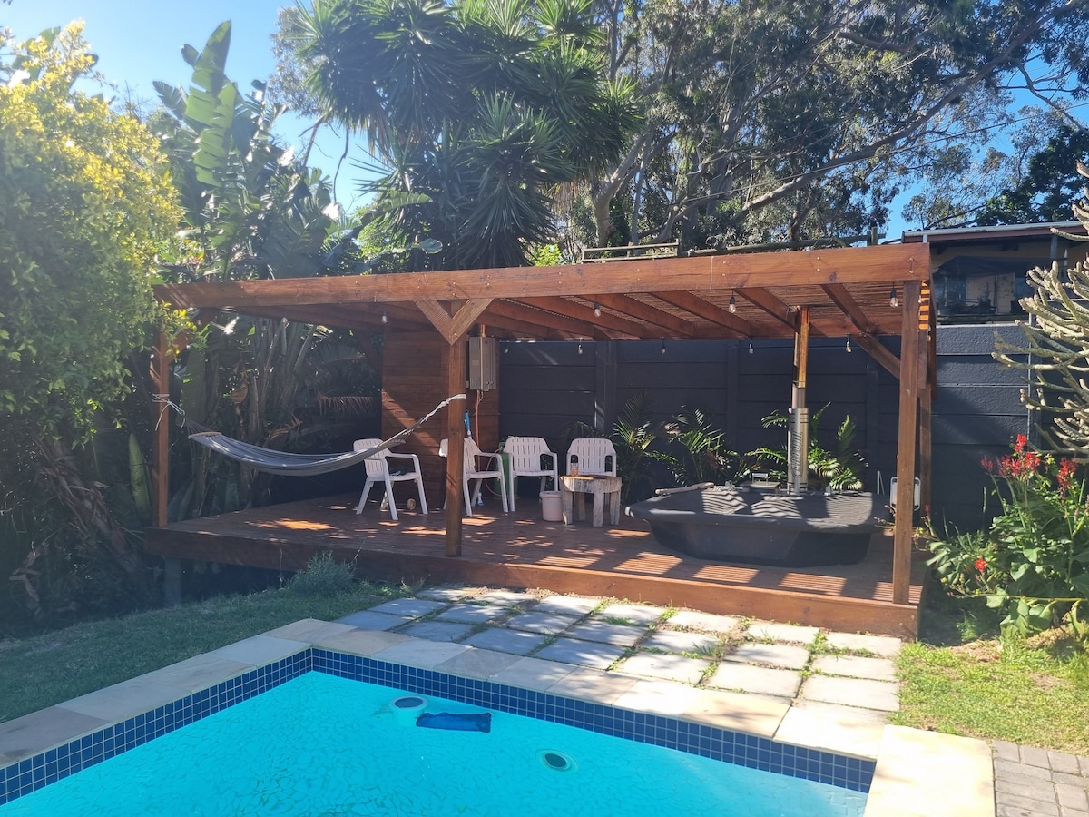 Welcome to your perfect escape A charming, spacious home designed for comfort & convenience. Ideally located near the beach, shopping, & entertainment, this is your ideal retreat for relaxation, work, or play. Unwind without leaving the property! •A refreshing pool •A charming on-site café •Free parking for 2 cars close to the front door •A serene braai area & garden with a complimentary bag of wood, (additional can be purchased in advance) Airport pickup available