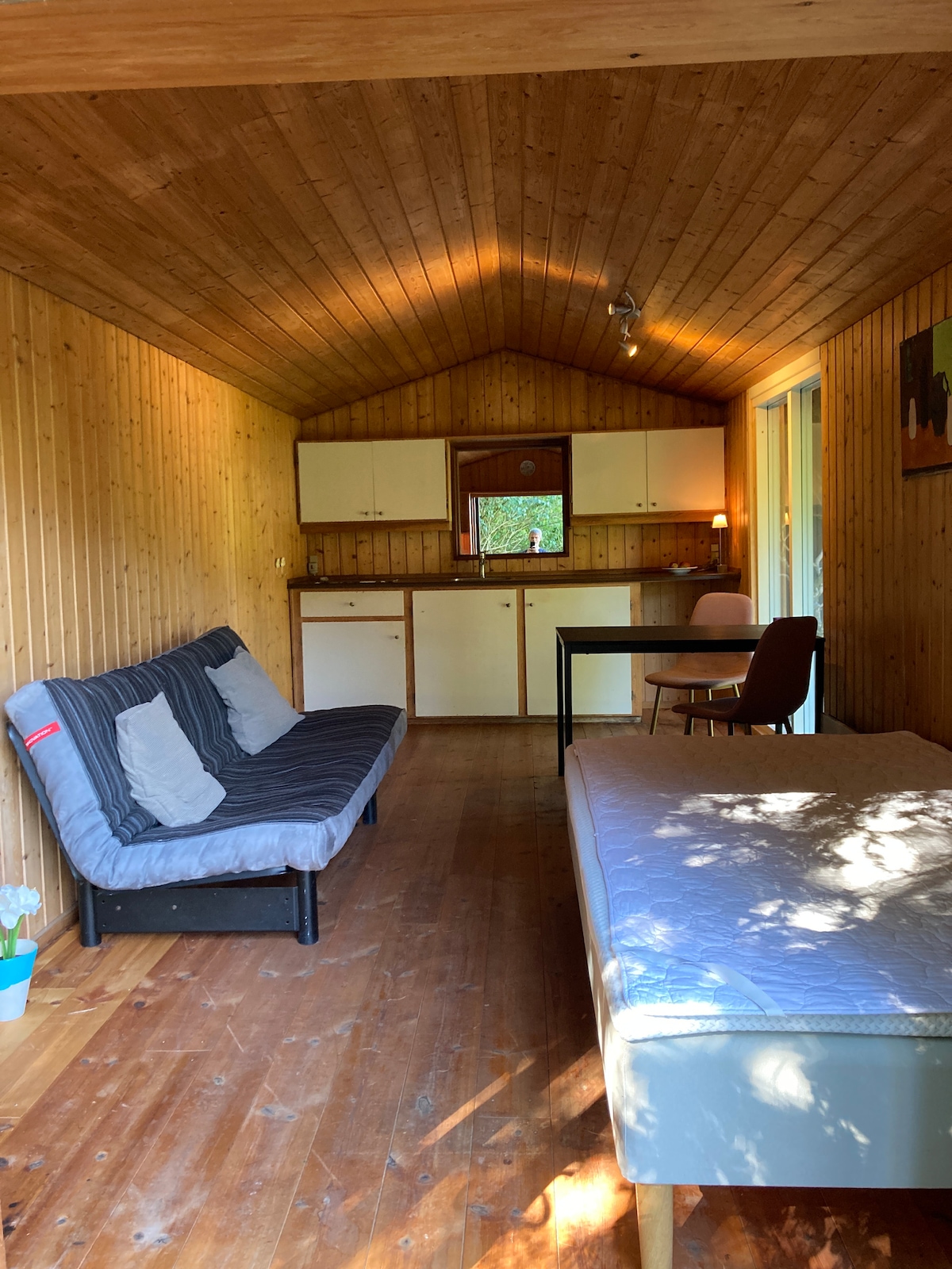 Stilfuld 25 m2 bjælkehytte. Egen lukket gårdhave med fliser og græsplane. Hytten er forsynet med klimaanlæg, lækkert køkkenafsnit med hvidevarer, samt bad og toilet. Parkeringsplads tæt på hytten. boligen og gårdhaven er afskærmet fra hovedhuset med egen indgang. Hytten er forsynet med sovesofa, “IKKE EN SENG”, med top madras 140 x 210. Den er beregnet til 2 voksne. Der er plissesolgardiner overalt, ikke mørklægningsgardiner. Mulighed for opladning af el-bil. Overdækket cykelparkering.