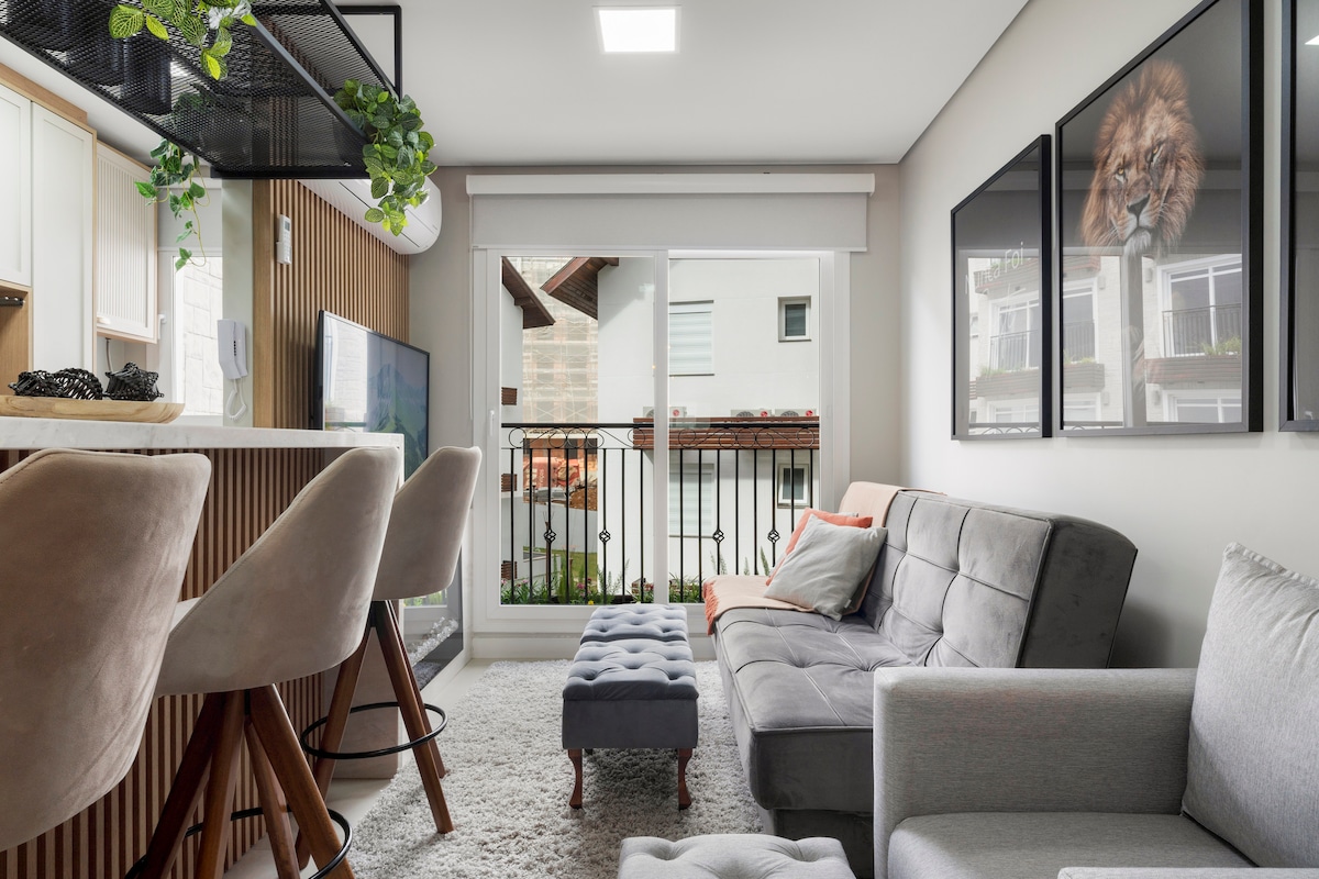 Viva momentos únicos na Serra Gaúcha! Hospede-se em um flat completo com a estrutura de um hotel e o conforto de casa. Lareira, piscina aquecida, sauna, brinquedoteca, academia e muito mais. Nosso flat está em local tranquilo, apenas 700 metros da Catedral de Pedra (cartão postal/centro de Canela). Fica em uma rua residencial arborizada, com fácil acesso a cafés, restaurantes e lojas. Ao lado área verde, contato com a natureza. Serviço de café da manhã (custo à parte) entregue no apto.