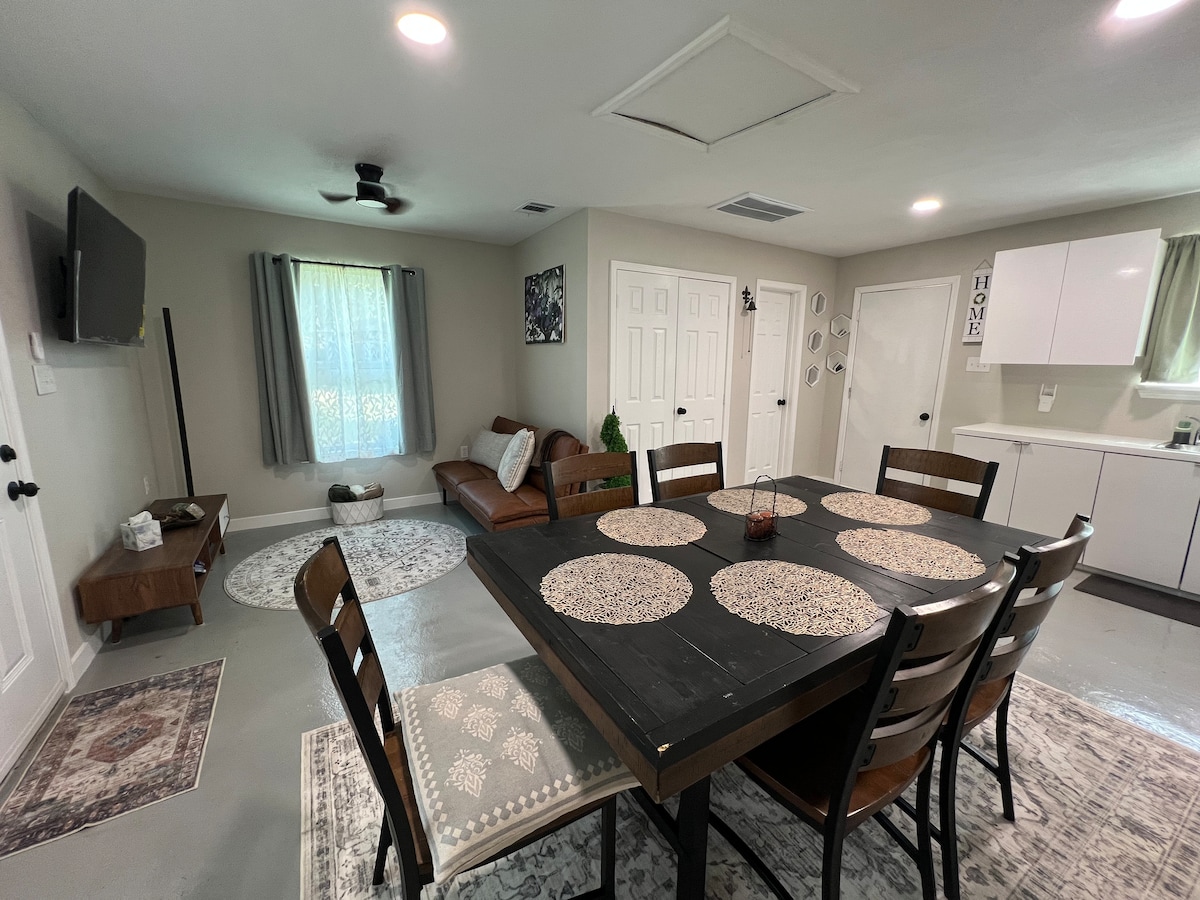 Recharge your soul in our cozy renovated Airstream! Whether you are traveling for work, visiting friends or trying to take a break from the chaos of life this is the perfect glamping experience. Enjoy a spacious layout that includes a queen sized bed, kitchenette with all the basics should you decide to cook a meal, nice dining area that could also double as a workspace, and comfortable shower.