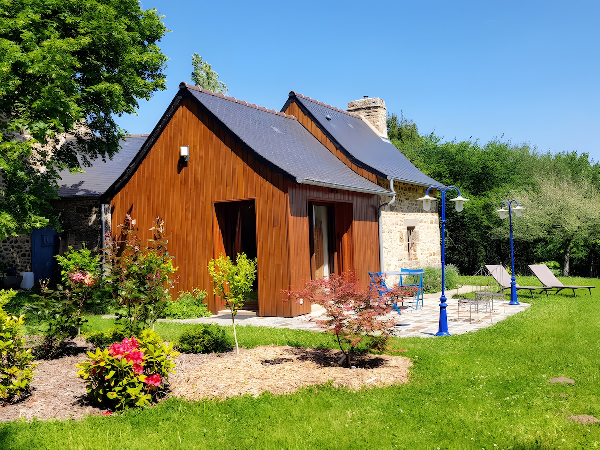 Détendez-vous dans ce logement calme et élégant. Niché dans la verdure à proximité Mt St Michel/St Malo/Dinard. surface 20 m2 avec terrasse privative. Équipé frigo/micro-ondes/chauffage/Plateau courtoisie/Douche (chaude)/WC (toilette sèche)/ BBQ (charbon non fourni) terrasse/parking commun/Jacuzzi dans bâtiment annexe (partagé avec autre logement)/lit 2 places/canapé. Pour cavaliers paddock face cabane. Petit déj inclus. Repas sur demande. Utilisez Waze pour arrivée facile au domaine Tyg’ouest