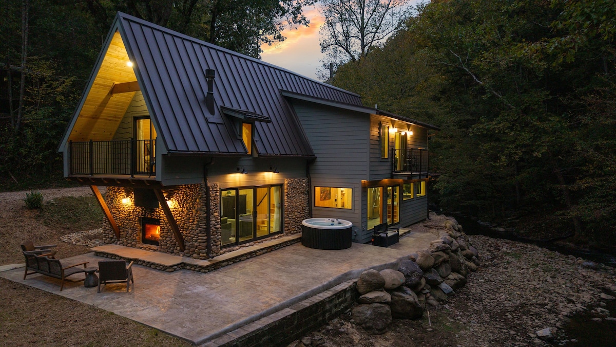 Escape to this Waterfront Luxe A-Frame Chalet — a stunning 3-bed, 3-bath architectural retreat that sleeps 10 just minutes from the Great Smoky Mountains National Park. Enjoy a private riverfront beach, outdoor hot tub, and fire features under the stars. Inside, discover soaring ceilings, custom cabinetry, heated floors, and hand-laid stonework surrounded by massive boulders, mountain landscaping, and panoramic river views — pure Smoky Mountain serenity.