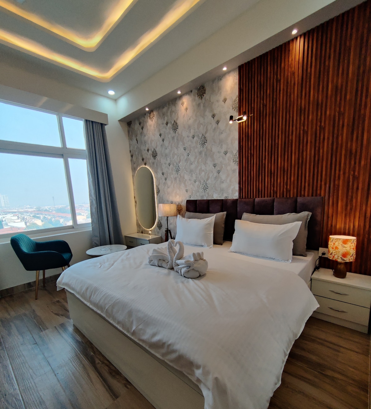 Kick back & relax in this calm & luxurious studio with the warmth of home & the vibe of a high-end hotel. Furnished with a plush King-size bed & modern décor. Amenities: 24/7 Grocery Store Modern Kitchenette High-Speed WiFi & TV Secure Parking outside tower but 24/7 Secured The first 2 floors has commercial shops, offering: Laundry Services Salon Café Medical Store Easy access to the India Expo Mart, Buddh International Circuit. Perfect for couples, solo travellers, or business partners.