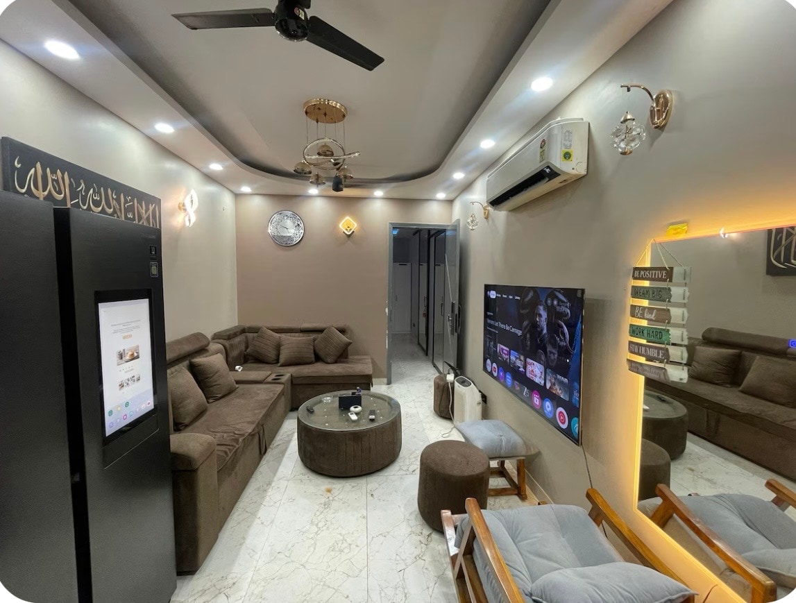 Our newly constructed 2 BHK apartment blends modern comfort with natural charm. The space features 2 serene bedroom with a queen-size beds, a spacious living room, a well equipped kitchen, 2 bathrooms: one attached to the master bedroom and another accessible from the living room and second bedroom and L- shaped balcony offering great view of the city. The property is located near a premium mall in Noida! This well-situated location offers you the convenience of shops, cafes, and entertainment.
