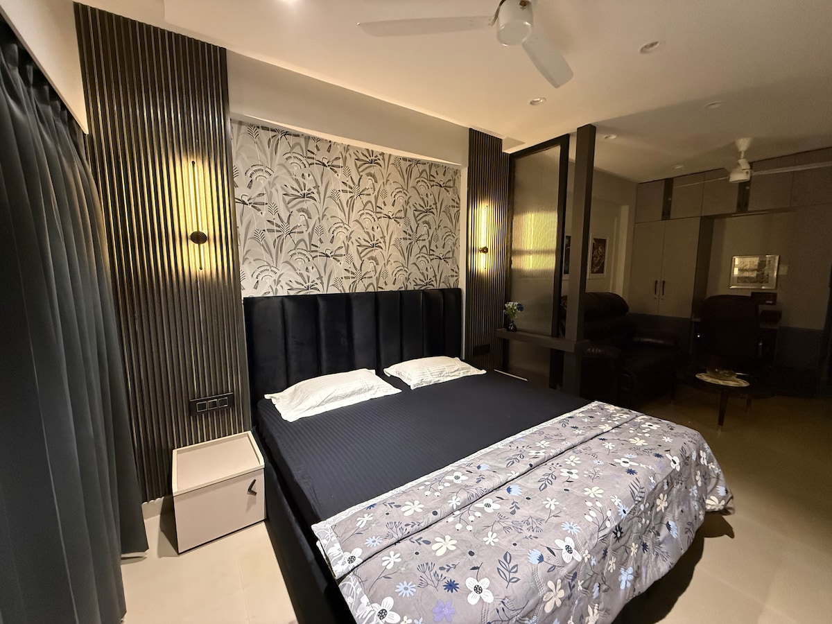 Experience comfort in our stylish 1BHK with a spacious balcony for your morning coffee or evening relaxation. It has a comfortable king-size bed and ample storage space. The living area is designed for comfort, with a plush sofa set and a dining table perfect for meals or work. The fully equipped kitchen has everything you need to cook, including utensils & modern appliances. Perfect for enjoying with your family, partner, or even solo, it is ideal for a cozy stay with all the comforts of home.