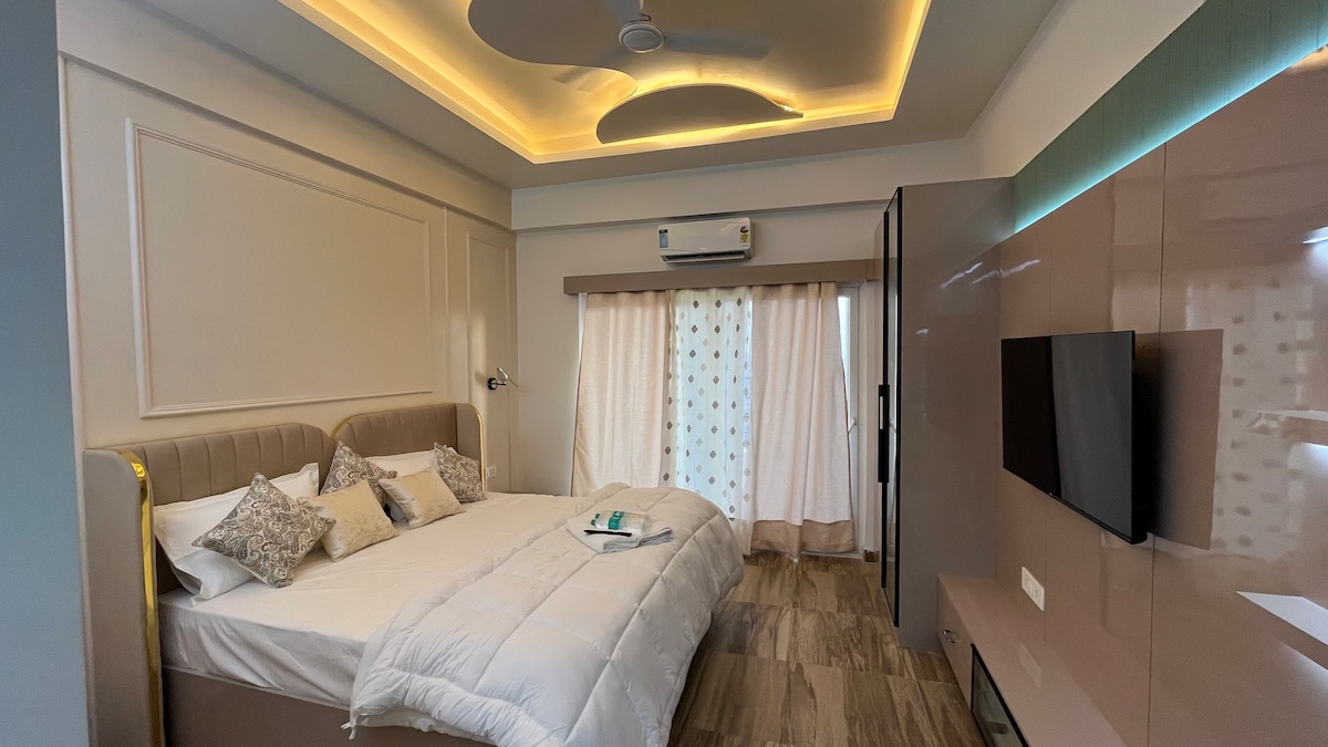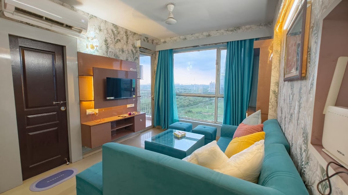 Winter-ready luxury studio near Expo Mart & Metro. Cozy, festive, couple-friendly stay with balcony, Wi-Fi & free parking at Wegmans Tower. Designed with warm tones, elegant décor, and modern comfort, it’s the perfect retreat for business travelers, couples, or families. Enjoy cozy interiors, high-speed WiFi, and easy access to the India Expo Center and Delhi NCR. Whether for work or leisure, your stay here promises style, comfort, and memorable moments.