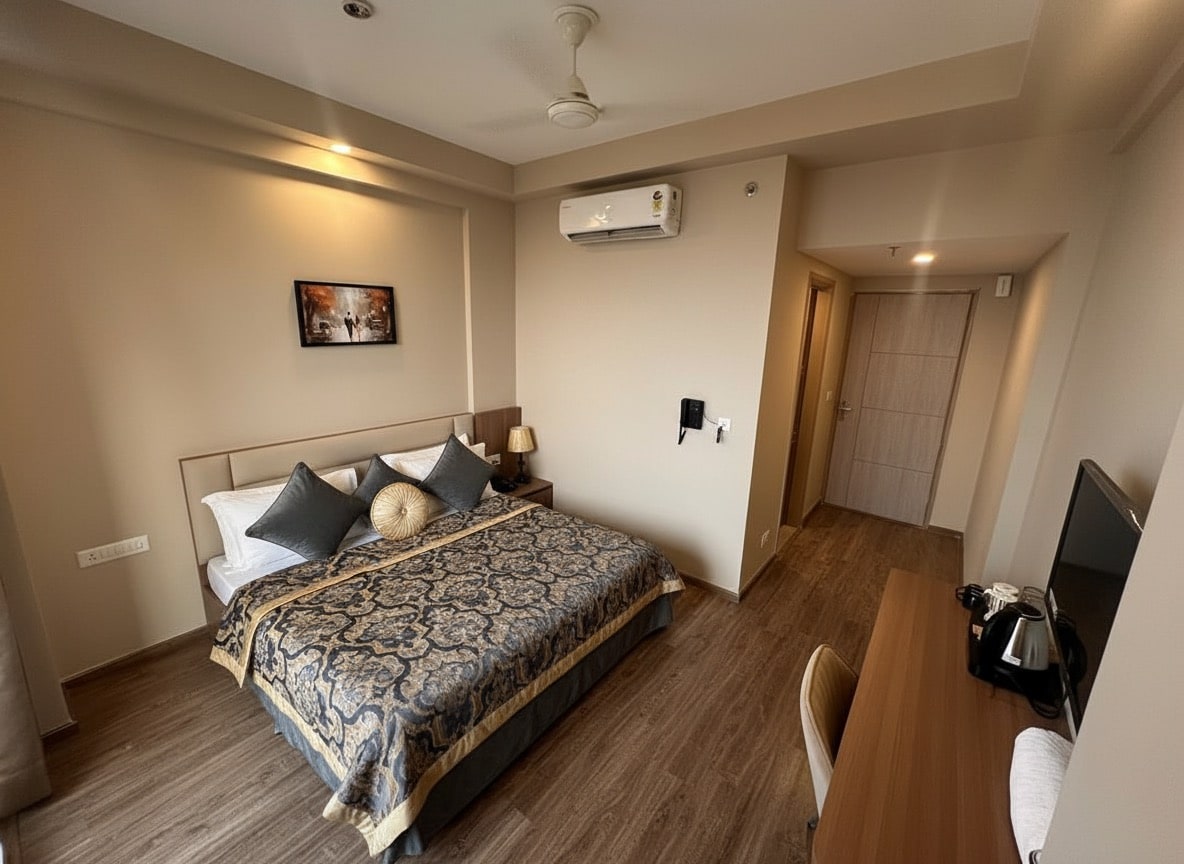 Kick back & relax in this calm & luxurious studio with the warmth of home & the vibe of a high-end hotel. Furnished with a plush King-size bed & modern décor. Amenities: 24/7 Grocery Store Modern Kitchenette High-Speed WiFi & TV Secure Parking outside tower but 24/7 Secured The first 2 floors has commercial shops, offering: Laundry Services Salon Café Medical Store Easy access to the India Expo Mart, Buddh International Circuit. Perfect for couples, solo travellers, or business partners.