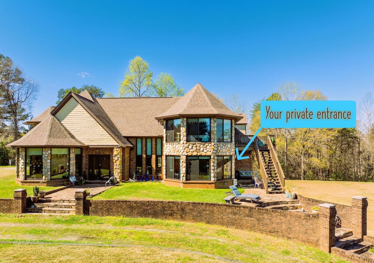 MINI PRIVATE OASIS. 6 MILES TO DOWNTOWN GREENVILLE! LAKEFRONT + PRIVATE DOCK NY Times #1 AMERICAN CITY! Experience modern luxury in your serene mini suite. Please note: the suite is located as an extension attached to a classical Scandinavian chalet. The suite is private. No shared spaces, shared soundproofed wall. 6mi downtown Greenville Amenities include: - Private entrance & patio - Private dock - 43” Roku TV - Charcoal grill, fire pit - Luxury toiletries - Blackout curtains