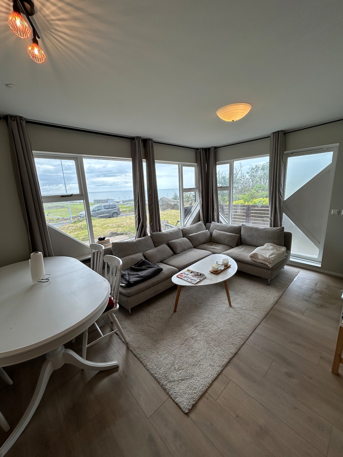 Apartament z dwiema sypialniami w których znajdziesz podwójne łóżka o wymiarach 160x200. Dla 5 gościa przygotowujemy dostawkę, natomiast dla małego dziecka na życzenie łóżeczko. Jest też w pełni wyposażona kuchnia oraz łazienka w której znajdziesz niezbędne kosmetyki i ręczniki, a także salon. Jest to spokojne miejsce z widokiem na ocean. 10 minut pieszo do latarni morskiej. 12 minut samochodem do lotniska. Doskonałe miejsca aby rozpocząć lub zakończyć swoją przygodę na Islandii.
