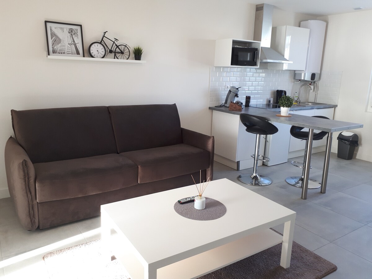 Studio lumineux refait à neuf, entièrement équipé et indépendant avec jardin. Quartier résidentiel et calme, stationnement gratuit et sécurisé, idéalement situé pour tous vos déplacements et visites avec commerces à proximité pour toutes vos nécessités. - Visites : Groupama stadium et LDLC Aréna (7min), Eurexpo et Lyon centre (20min), Meyzieu ZI, Markadas, parc Grand large, Via-Rhôna (5min) - transports: tram T3 , bus TCL, aéroport/TGV Lyon-St Exupéry, autoroute Lit bébé dispo