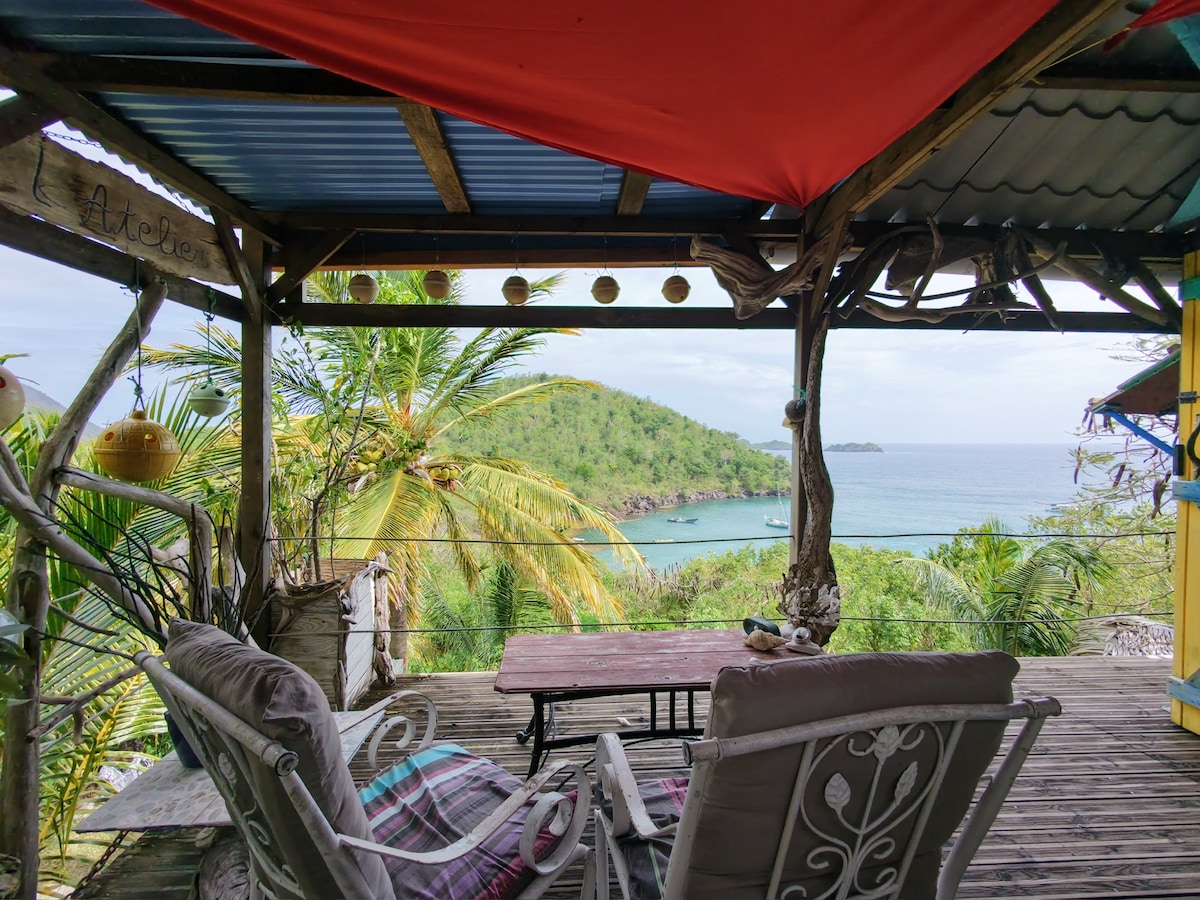 Perchée à flanc de colline en lisière de forêt, notre cabane permet aux voyageurs en solo ou en duo de séjourner dans une végétation luxuriante, des brasseurs d'air assurent une fraicheur confortable. A 2 minutes du bourg de Deshaies et de ses commerces. Elle découvre une vue panoramique sur la baie de Grande Anse et sur le verdoyant Gros Morne. La discrète silhouette du volcan de Montserrat révèle parfois sa présence. (Ne convient pas aux enfants/hauteur sans protection. Pas de climatisation.)