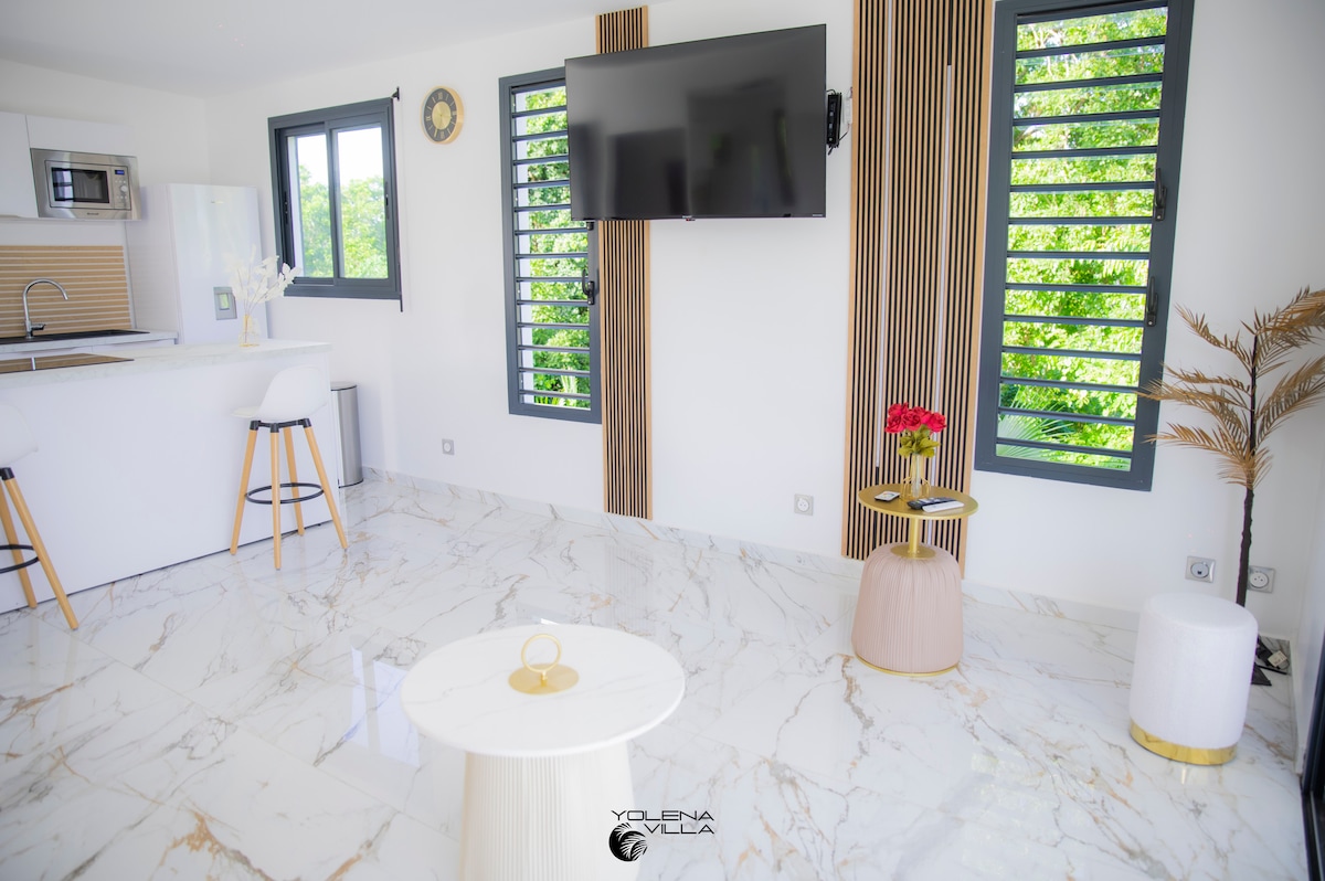Bienvenue dans notre charmant studio, idéalement situé à Ste Anne. Notre studio offre un espace paisible et confortable pour les voyageurs en quête de tranquillité. Profitez de notre petite cuisine entièrement équipée pour préparer vos repas, détendez-vous dans le canapé convertible après une journée à explorer les trésors de l'île et rafraîchissez-vous dans la piscine partagée avec la maison principale située au-dessus. N'hésitez pas à nous contacter pour toute question ou demande spécifique.