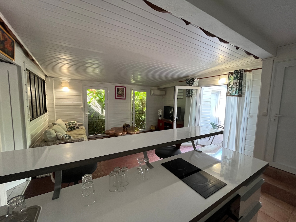 LE MANIOC Située en plein Cœur de notre iles si accueillante, dans une petite résidence locale, non loin de tout commerce ( boulangerie, épicerie, pharmacie, docteur etc.….). Nous vous proposons une chambre climatisé avec rangement, un salon avec un canapé convertible pour se détendre après une belle journée d'exploration. Une cuisine équipée ouverte, une salle de bain avec w.-c. et une terrasse équipée d'une bar extérieur