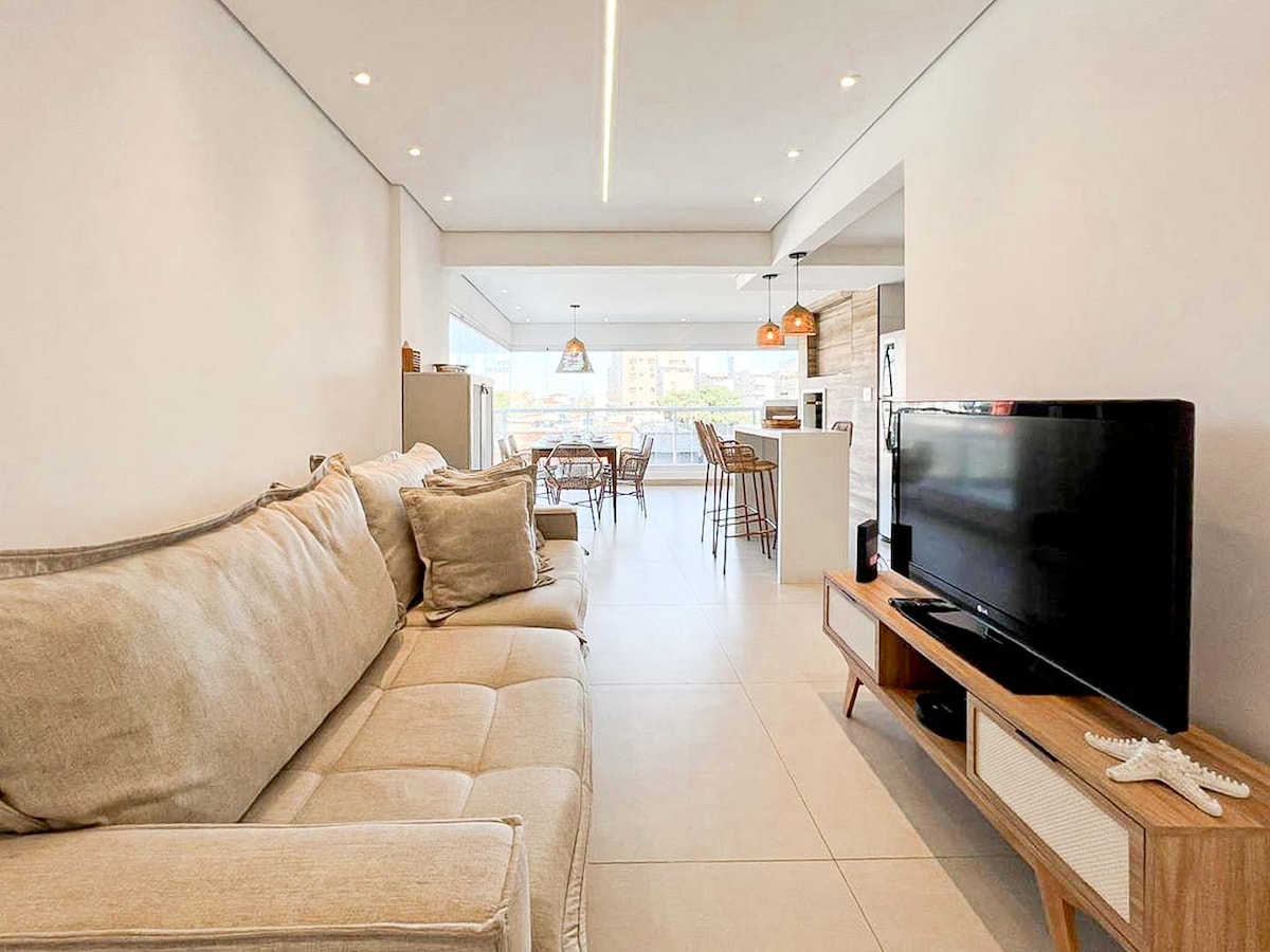 Parcele com Airbnb, em até 6x sem juros. Opção de Early checkin as 9 hs ou late checkout às 18 horas, basta levar lençol e toalha de banho. Temos travesseiros, mantas e capas de colchão. São 4 minutos a pé até a praia. São 2 vagas de garagens,com vista para o mar é completa com (piscina e churrasqueira privada) Rua tranquila e arborizada. Excelente localização com tudo o que precisar ao redor. Com mercados a 1 quadra, farmácia 4 q, bancos, fast foods 6 q, restaurantes 1 q, e 2 Smart Fit, teatro