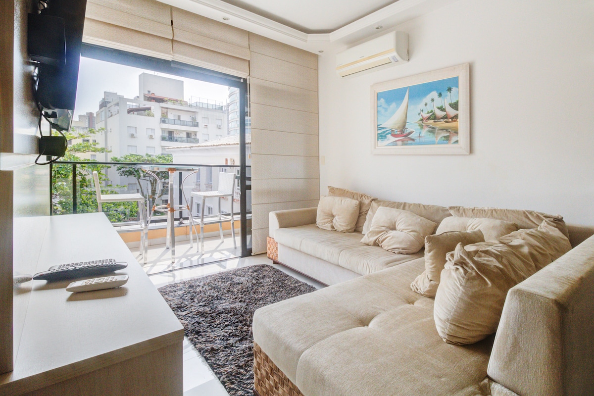 Pé na areia, frente total para o mar com varanda: som das ondas, pássaros, paisagem de tirar o fôlego com vista espetacular. Esse é um apartamento da grife "The Perfect View" -- sempre vistas perfeitas com estilo. A varanda é integrada com uma ampla sala, com vista para o mar. Decorado com design exclusivo oferecendo experiencia única para relaxar ou trabalhar à distância -wi-fi de alta velocidade , ar condic. em todos os cômodos, smart TVs e home office. Uma vaga na garagem com manobrista.