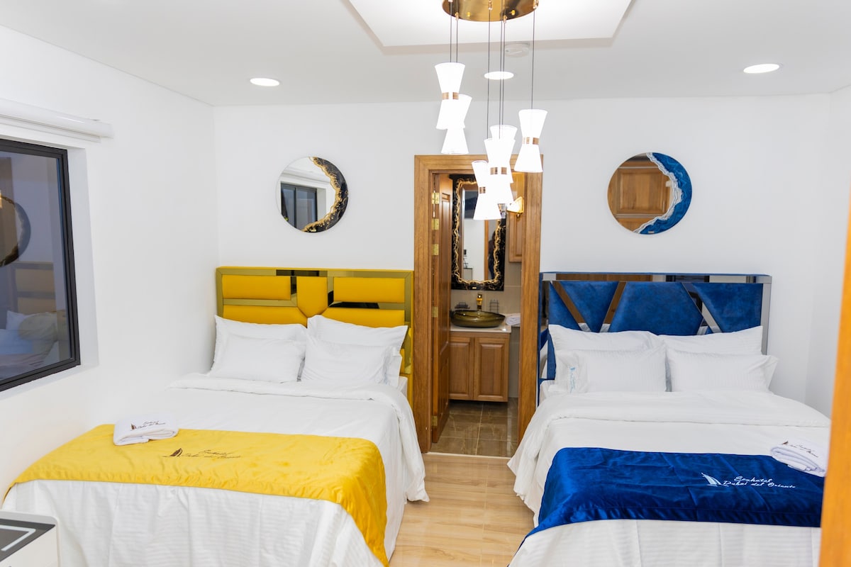 Habitación temática Aguamarina en el corazón de Guatapé, a solo 2 min del parque principal. Disfruta de desayuno artesanal, spa, WiFi veloz y atención personalizada. Único hotel con ascensor en la zona urbana. Zonas comunes, café de origen y detalles vibrantes. Vive Guatapé desde el color, el descanso y el diseño.