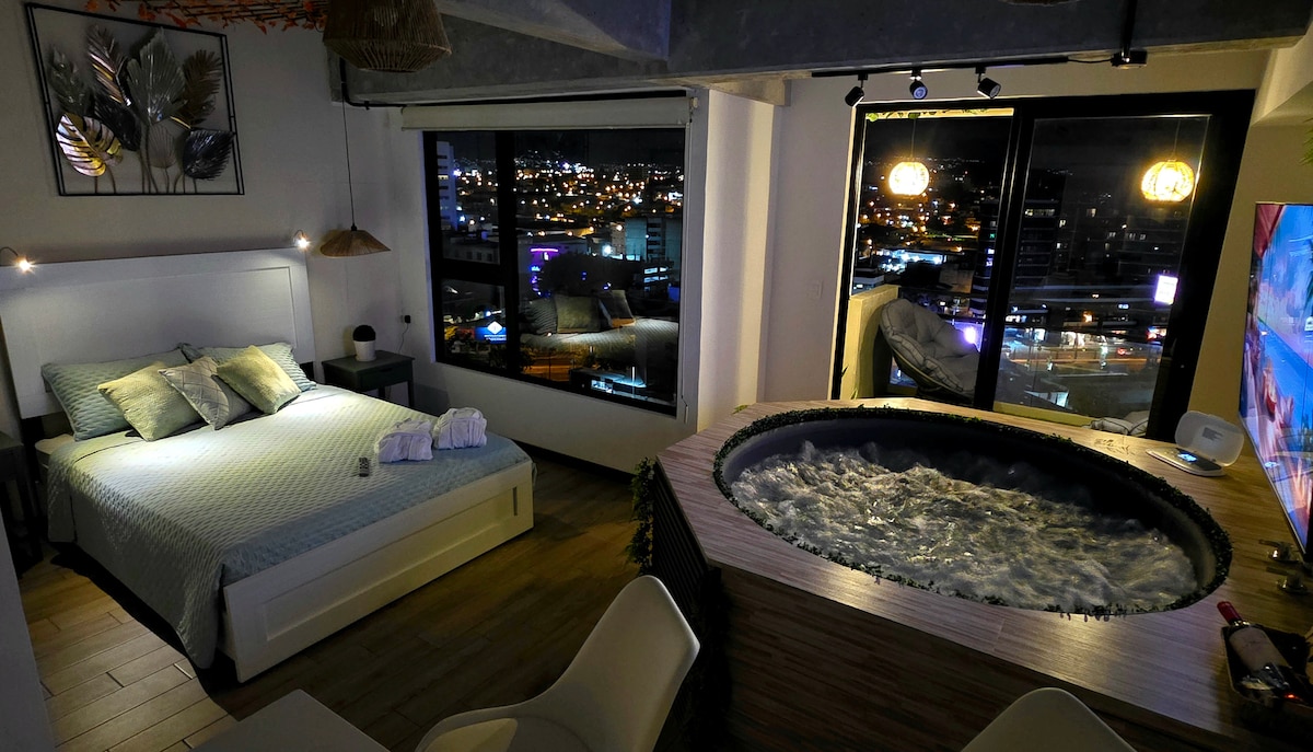 Jacuzzi en la Habitación totalmente privada. Disfruta de una experiencia con estilo en este alojamiento en la mejor area de la ciudad, a pocos metros del aeropuerto. Con un balcon con jacuzzi, nuestra suite de lujo tiene una vista impresionante donde veras los aviones aterrizar. Es una muy buena opcion para ti para quedarte, tiene un estilo moderno, area para home office, nunca te aburriras mientras trabajas, conocelo!!