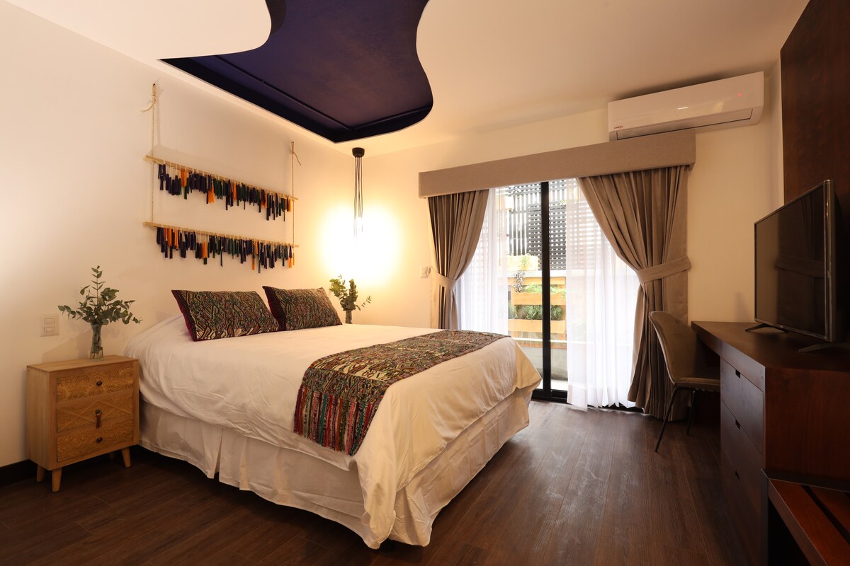 Habitación moderna en céntrico hotel boutique en la ciudad de Guatemala. La habitación cuenta con una cama Queen, aire acondicionado, TV Smart, closet y baño privado. Capacidad 2 personas. El hotel boutique cuenta con recepción las 24 horas, parqueo gratis para un vehículo dependiendo disponibilidad, terraza, jardín y se encuentra en la zona 10, una de las mejores zonas de la ciudad. A 5min de Oakland Mall y de la zona viva. Ofrecemos traslado del aeropuerto por Q40 por hasta 5 personas.
