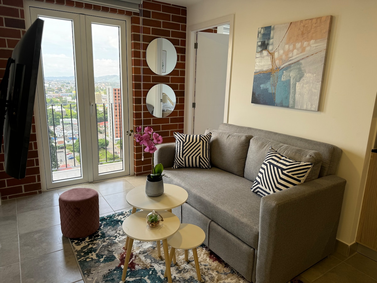 Si vienes por negocio o por placer, estadías largas o cortas, nuestra suite de lujo es el sitio indicado. Con una espectacular terraza privada en lo alto del edificio. Aquí podrás disfrutar del área al aire libre para comer, tomarte un café o un vinito! eso mientras disfrutas de una espectacular vista a la ciudad. Podrás usar el área para “Home Office”, disfruta mientras trabajas!. El apartamento tiene un diseño moderno y funciones inteligentes controladas con el asistente virtual Alexa.