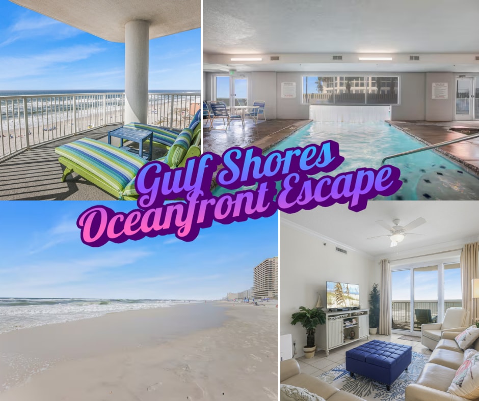 Experience luxury and comfort in our beautifully remodeled 6th-floor condo with breathtaking views of the Gulf of Mexico. This beachfront condo is just steps away from Gulf Shores' best attractions, dining, and entertainment. Walk to popular spots like The Hangout, enjoy live music, or take part in water sports and golf—all within minutes! Features a private balcony with panoramic ocean views, a fully stocked kitchen, high-speed Wi-Fi, in-unit laundry, a fitness center, and a heated pool.