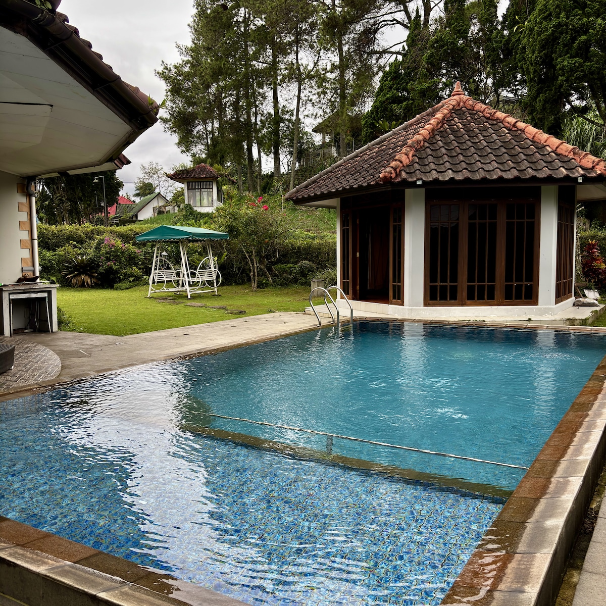 Our villa is located inside a really big estate where the occupants can enjoy natural scenery like forest with high trees and streaming river. This is a perfect choice for a quick getaway in a remote area with cool fresh air. The altitude is 1000 meter. Temperature 15-23 Celcius. Although the complex is secluded, it's not far from restaurants, cafes and supermarkets. You can walk or jog around the complex, swim or play tennis, enjoy the view of trees and lights of the city from our villa.