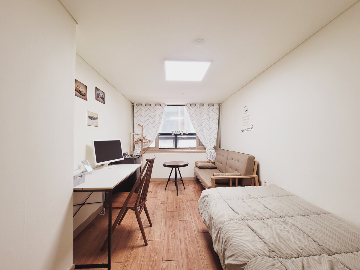 '- 房间24.75平方米,床135*200,书桌1070*700,可以保管行李 - 具备可办公、可做饭的简单餐具,智能电视 50 英寸 - Wifi, 大衣柜, 大冰箱, 洗衣机, 晾衣架, 吹风机, 毛巾, 纸巾, 水 收费停车 洗发水、沐浴露、护发素、香皂 - 从仁川机场到宿舍正门乘坐机场巴士时56分钟(包括6分钟步行) - 从宿舍可以走着去的地方 大创(6分钟),OLIVE YOUNG(3分钟),时代广场(3分钟),汗蒸房(6分钟) -从宿舍坐地铁去的地方 (附近有 1 号线永登浦站、2 号线文来站、5 号线永登浦市场站) 东大门 DDP(41 分钟),汝矣岛汉江公园(21 分钟),清溪川(41 分钟),景福宫(39 分钟) 弘益大学入口站(24分钟),北村韩屋村(41分钟),明洞(36分钟),圣水洞(47分钟) 文来洞(12分钟),永登浦站是KTX停车站,去釜山等地方很方便。 清晨感受着从窗户照进来的温暖阳光 晚上坐在房间的窗边享受时代广场的夜景