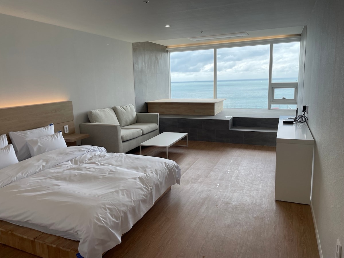 โ2F 201ํธ (1์ง) โ25ํ ํธํ ์ ์ค์ ๋ทฐ ์ค์ํธ๋ฃธ. ํธ์ ๊ฐ์ ๋ฐ๋ค ์ ๋ง๊ณผ ๋ ํธ๋ก ๊ฐ์ฑ์ ๋ถํฐํฌ ์ธํ ๋ฆฌ์ด๊ฐ ์ด์ฐ๋ฌ์ง ๊ณต๊ฐ์ผ๋ก, ์กฐ์ฉํ ๋จธ๋ฌผ๋ฉฐ ํธ์ํ ํด์์ ์ฆ๊ธธ ์ ์์ต๋๋ค.โ โA 25ใก hotel-style suite with a serene lake-like ocean view. Designed with retro-inspired boutique interiors, perfect for couples seeking a calm and stylish getaway