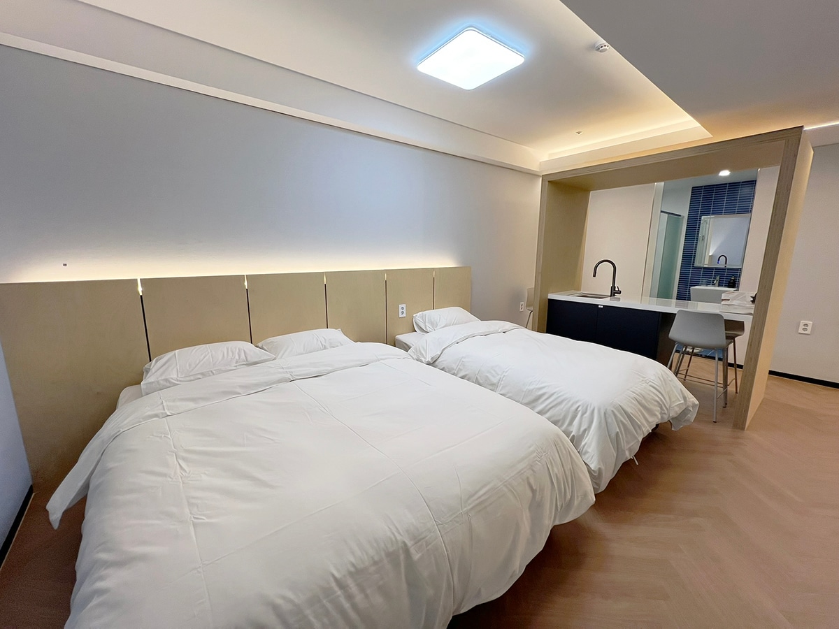 ์๋ ํ์ธ์ "์๋ ,ํ์ฌ"์ ๋๋ค. ์๋ ,ํ์ฌ์ ๋ํด๋ฐ๋ค๋ก ์ฐ์ธ, ๊ฐ์กฑ๊ณผ ํจ๊ป ์ฌํ์ค์๋ ๋ถ๋ค์ด ํธ์ํ๋ฉด์ ์ฆ๊ฒ๊ฒ ๋จธ๋ฌผ๋ค ๊ฐ์ค ์ ์๋ ๊ณต๊ฐ์ ๋๋ค. ํ์ฌํด์์์ฅ์ด ๋๋ณด 5๋ถ๊ฑฐ๋ฆฌ์ ์๊ณ ๊ฑฐ์ค ํ ์ด๋ธ์ ์์ ์ค์ ๋ทฐ๋ฅผ ์ฆ๊ธธ ์ ์๊ณ , ์นจ์ค์ ์ค์น๋ ๋นํ๋ก์ ํธ์ 100inch ์คํฌ๋ฆฐ์ผ๋ก ๋ทํ๋ฆญ์ค๋ฅผ ๋ณด๋ฉฐ ์์์์๋ ์ฆ๊ฑฐ์ด ์๊ฐ์ ๋ณด๋ผ ์ ์๋ ํน๋ณํ ๊ณต๊ฐ์ ๋๋ค. โฐ ์นจ์ค1๊ฐ, ๊ฑฐ์ค, ์ฃผ๋ฐฉ, ํ์ฅ์ค1๊ฐ๋ก ๊ตฌ์ฑ๋ ์ค์ ๋ทฐ ์์์ ๋๋ค. โฐ ์นจ์ค ํธ์นจ๋, ๊ฑฐ์ค ์ผํ๋ฒ ๋๋ก ์ต๋4์ธ๊น์ง ์ด์ฉ๊ฐ๋ฅํฉ๋๋ค. โฐ ์นจ์ค ๋ด ๋นํ๋ก์ ํธ์ 100inch ์คํฌ๋ฆฐ์ผ๋ก ๋ทํ๋ฆญ์ค ์์ฒญ๊ฐ๋ฅํฉ๋๋ค. โฐ ๋ฌดํ์์ด์ปจ ๊ฑฐ์ค๊ณผ ์นจ์ค ๊ฐ 1๋ ์ค์น๋์ด์์ต๋๋ค. โฐ ์ฃผ๋ฐฉ ๋ด ๋นํธ์ธ ๋์ฅ๊ณ , ์ ๊ธฐ์ฟกํ, ์ ์๋ ์ธ์ง, ์๋ ฅ๋ฐฅ์ฅ, ์ปคํผํฌํธ๊ฐ ์์ด ์กฐ๋ฆฌ๊ฐ ๊ฐ๋ฅํฉ๋๋ค. โฐ ๋๋ผ์ธํ๊ธฐ๊ฐ ๋นํธ์ธ๋์ด ์ธํ๋ ๊ฐ๋ฅํฉ๋๋ค. โฐ ๋ฐ๋์ค์, ์ดํธ, ๋ฆฐ์ค, ํผํด๋ ์ง, ์น์ฝ์ด ๋น์น๋์ด ์์ต๋๋ค.(์นซ์,์ค์ํ์์ ์ ๊ณต๋์ง ์์ต๋๋ค.) โฐ ๋ฐ๋ ค๋๋ฌผ ๋๋ฐ๋ถ๊ฐ์ ๋๋ค.