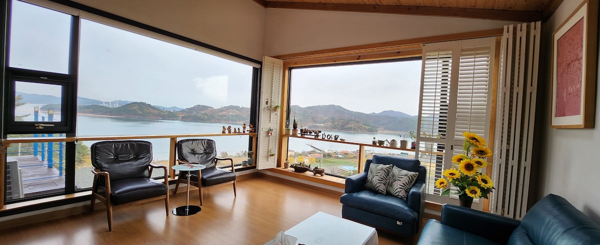 ■높은 천창과 바다를 파노라마로 볼수 있는 거실 공간이 있는 목조주택에서 온 가족과 함께 즐거운 시간을 보내세요. ■남해여행 초입에 위치한 별장을 공유합니다 (바베큐가능하도록 준비해두었습니다) ■20평 모던한 분위기의 청결하고 편안한 목조주택으로 침대방(2층침대;아래층 더블/위층 싱글) 전면 유리통창 거실. 주방. 넓은욕실로 이루어져 있습니다. 마트는 차로 5분~7분 거리에 창선농협,하나로마트가 있으며,도보로 2분거리에 CU편의점이 있습니다. 회는 6분거리에 있는 단항 회센터를 추천드립니다(전화문의주시면 추천상회 알려드릴게요)
