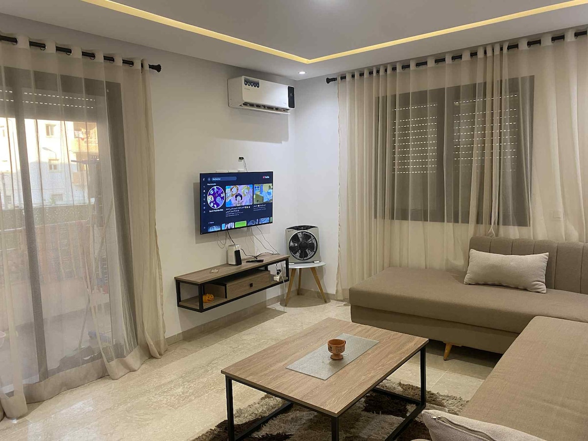 Boho-chic comfort in Sahloul 4, Sousse. Brand-new apartment in a luxury residence with a cozy living room, full kitchen, and private balcony offering beautiful sunset views. Perfect for solo travelers (especially solo female guests), couples, friends, or small families seeking a safe and relaxing stay. Located in a quiet neighborhood, just 15 minutes from the beach, and close to cafés, restaurants, and shops. Enjoy modern amenities, artistic décor, and a warm atmosphere that feels like home.