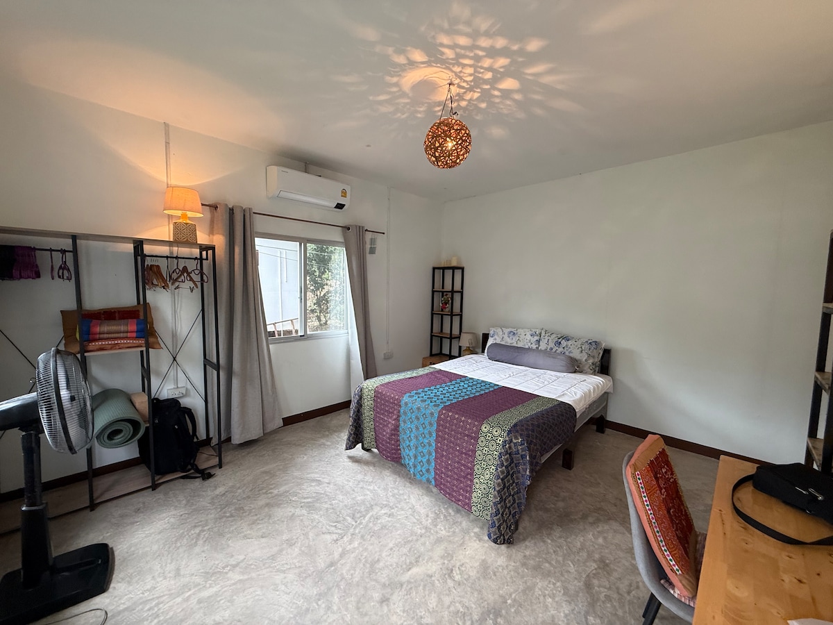 Relax at the guesthouse "Blue of Nature" near Chiang Mai City. In a peaceful village and built in 2023, this fresh, modern space is behind the main house, enveloped by greenery. It's brand new with bright windows, a cozy king bed, a small kitchen with essentials, and a clean bathroom. Enjoy amenities like TV, A/C, and fast internet. It's near the Royal Park Rajapruek. Enjoy made-in-order Thai meals from our chef with own organic garden herbs.