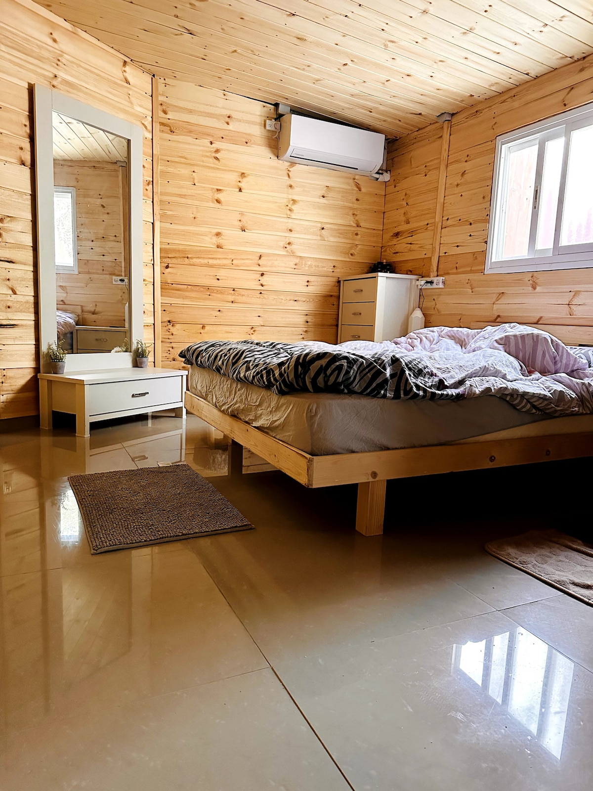 לשמור על פשטות במקום השקט ובמיקום מרכזי. הבקתה נמצאת בהרי יהודה בין ירושלים לתל אביב. על השביל שמוביל ליער קסום ( 3 דקות הליכה) בו קיימים שבילי הליכה רבים, פינות מדורה ועוד. לכן המקום שלנו מתאים מאוד למטיילים. כפי שרואים בתמונות היחידה מורכבת מבקתת עץ ויחידה נוספת שסגורה עם יריעת ברזנט. בינהם יש מרפסת יפה ומיוחדת. היחידה נמצאת בקומה השניה. יש לשים לב שבאמבטיה לא ניתן לעמוד בגלל מבנה התקרה, אך אם זה מפריע לכם אפשר לבדוק איתנו אם המקלחות חוץ שלנו פנויות. ביחידה אין מטבח, יש מיקרוגל, מקרר וקומקום.