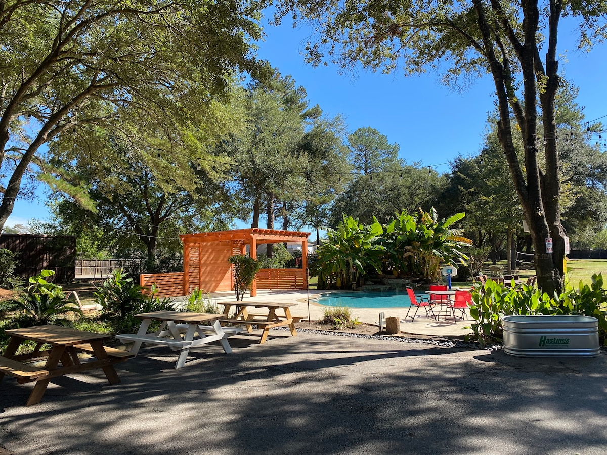Escape to this fully fenced 4-acre staycation retreat in the heart of Tomball! Enjoy 3 bedrooms, 2 baths, a fully equipped kitchen, and spacious living areas. Unwind in the sunroom with a 2-person sauna and 4-person indoor hot tub overlooking the garden and pool. Outside, relax by the pool with waterfall, gather at the fire pit, or play disc golf. Pet-friendly, with smart TVs in every room; perfect for families visiting Houston or seeking a peaceful getaway near local attractions.