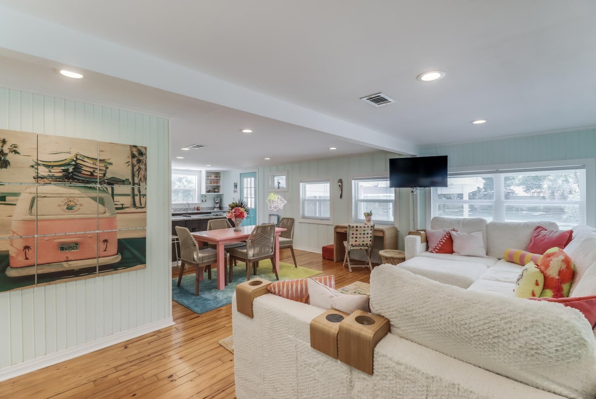 Welcome to The Gulfport Muse! Walk to the beach from this all-new home inspired by Gulfport’s vibrant art murals. Enjoy a fully stocked kitchen with ample cooking necessities, a loaded coffee bar, smart TVs in every room, and extra pillows & bedding. Relax in the large fenced yard with a fire pit and patio set. Multiple dining areas make gathering easy, and you can even watch the train pass from the porch- a true Gulfport charm!