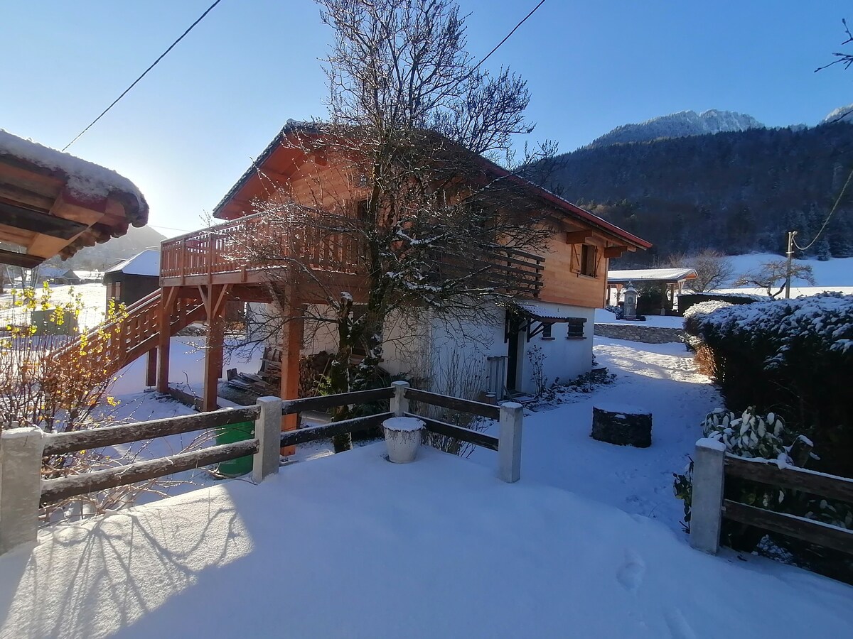Promo du 1er au 13 sept - 15 % Appartement 35 m² rez de jardin d'un chalet montagnard, avec une superbe vue sur la chaine du mont blanc et à proximité immédiate de tous les commerces, des navettes et du lac biotope 4 personnes (2 lits superposés et un canapé lit confortable). Nous acceptons les animaux, merci de le préciser lors de la réservation. Logement non-fumeur. La location pendant les périodes scolaires se fait du samedi au samedi. PS : photo de couverture prise du logement