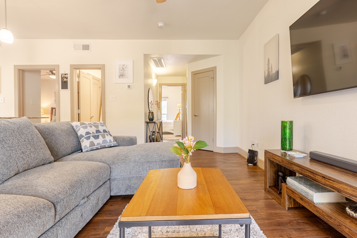 Perfect South Austin retreat just minutes away from the vibrant South Congress, trendy South Lamar, iconic Barton Springs, scenic Lady Bird Lake, and the heart of Downtown along with free parking. Inside, you'll find a spacious bedroom featuring a luxurious California king bed and ample closet storage. Large widows for natural light (curtains are on all windows for privacy) . For additional sleeping space, the cozy living room includes a convenient pullout queen bed from the comfortable couch.