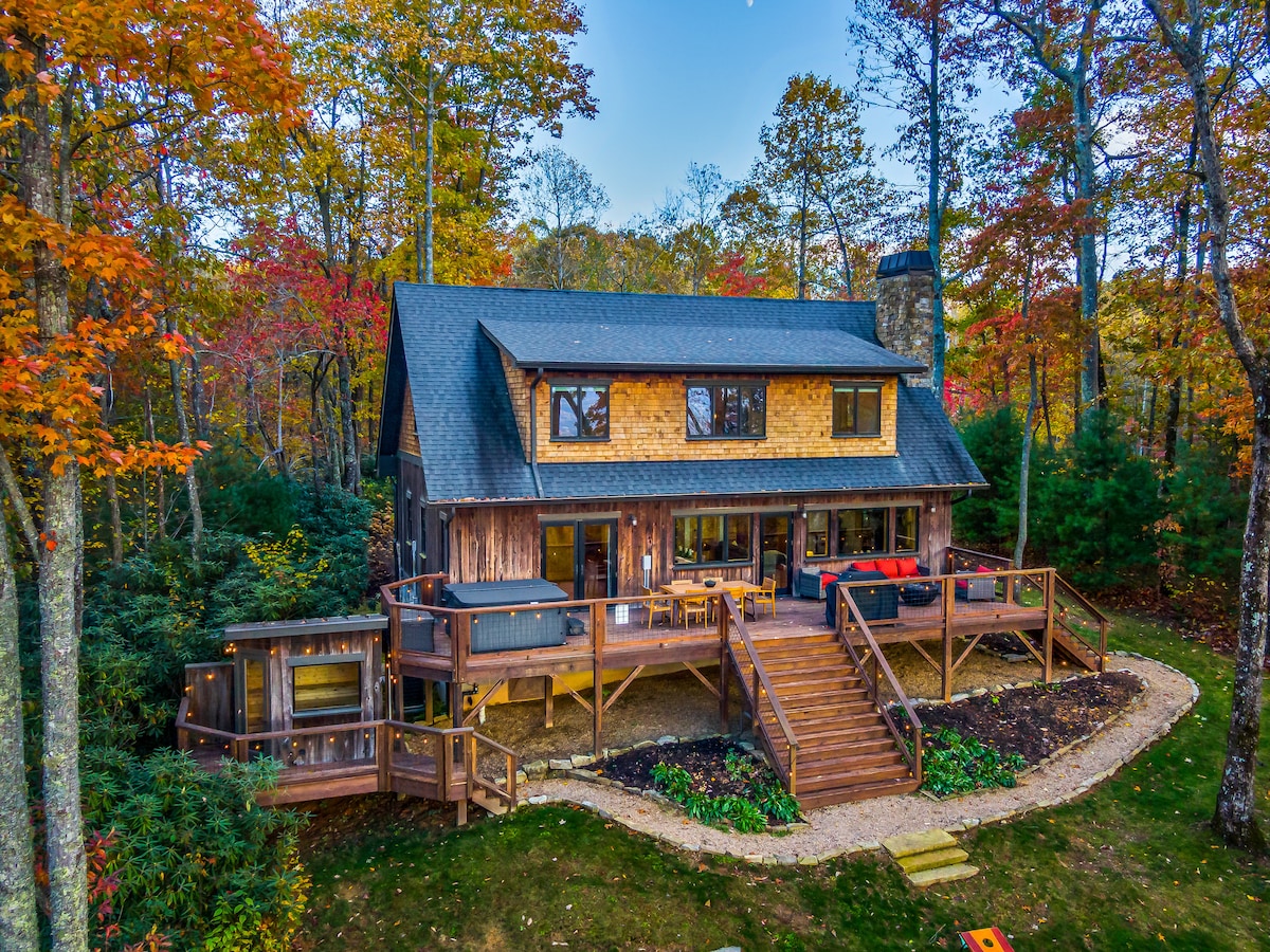 Stunning villa, perched atop a mountain, surrounded completely by other mountains. An expansive deck was designed and furnished intentionally to allow for guests to enjoy the LONG RANGE VIEWS from various angles. This Frank Lloyd Wright inspired villa takes the "city vibe" into the woods, with large windows bringing in light and showcasing the beautiful natural setting. Interior features are open, uncluttered, and incredibly comfortable, with quality at the forefront of our minds in this space.