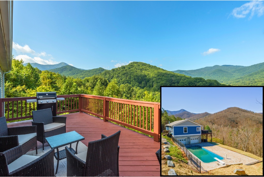 The best views in Asheville Highlights: -Heated Saltwater Pool (82 F, open mid spring to early fall) -Hot tub ($20k therapy tub, step above hot tub) -Game Room (double garage doors open to pool) -10 Mins to Blue Ridge Parkway entrance -15 Mins to Asheville (20 Min to downtown) -700sq ft Trex deck -2 Tempur-pedic mattresses; others also high end -Owned, operated, and cared for by NC residents (not property mgmt company) **NO POOL PARTIES; 12 Guests on property MAX; We have detection system
