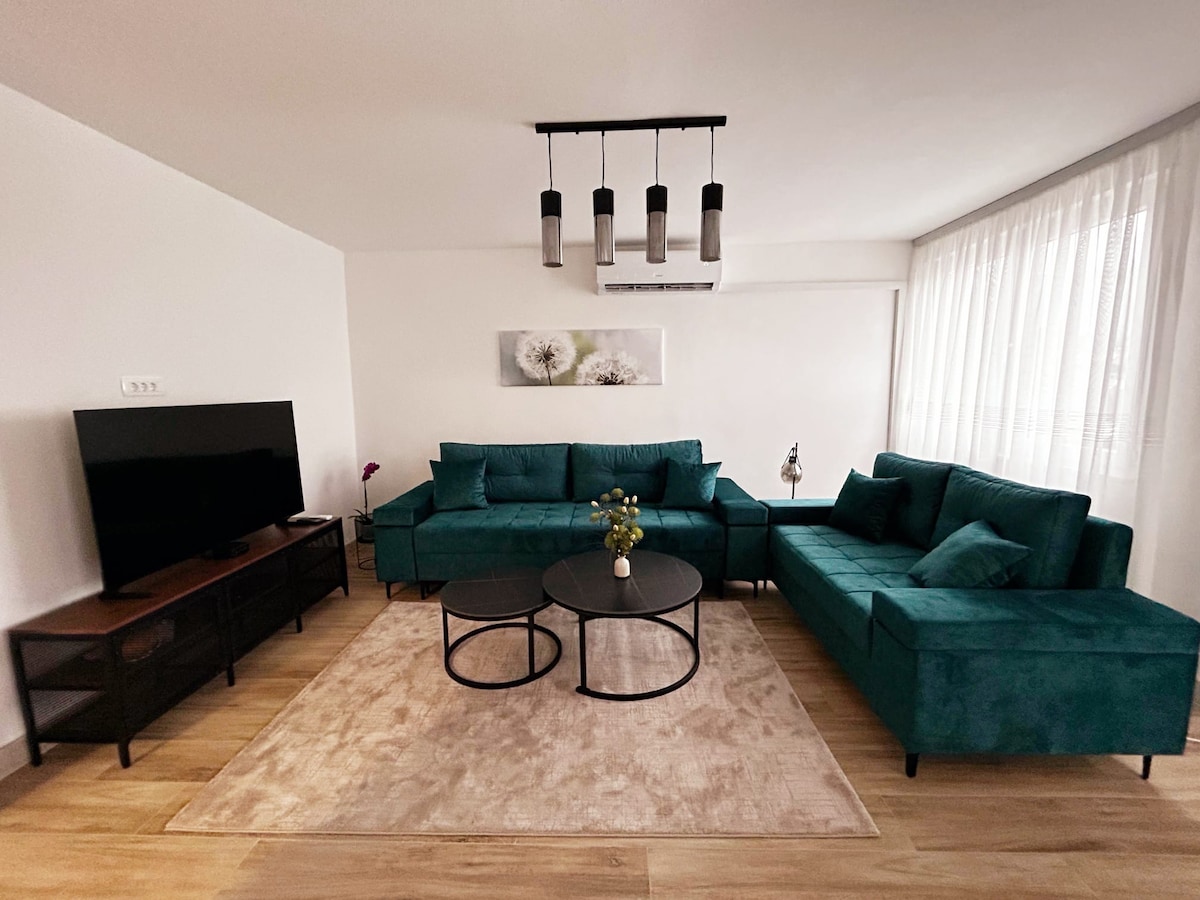 Enjoy a stylish experience at this centrally-located place in brand new building.The apartment consists of a bright bedroom with a comfy king-sized bed, dinning table for 4 persons and modern fully equipped kitchen. A sunlit living room with Smart TV. The pull-out corner in the living room can also serve as an additional bed for 2 more guests. The entire apartment was designed by architect (Adil Glavovic - axisarchiteture)