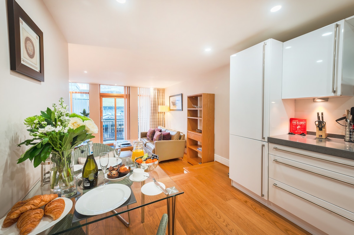Spacious and elegant, the City View One Bedroom serviced apartments are situated on the 3rd & 4th floors of the building. Spacious contemporary styled living areas have French windows leading out onto their balconies which are all equipped with outside furniture. The plush bedrooms have king or super-king size beds and en-suite bathrooms (walk-in showers or shower over bath). The high-quality modern kitchen is fully equipped with top quality fittings.