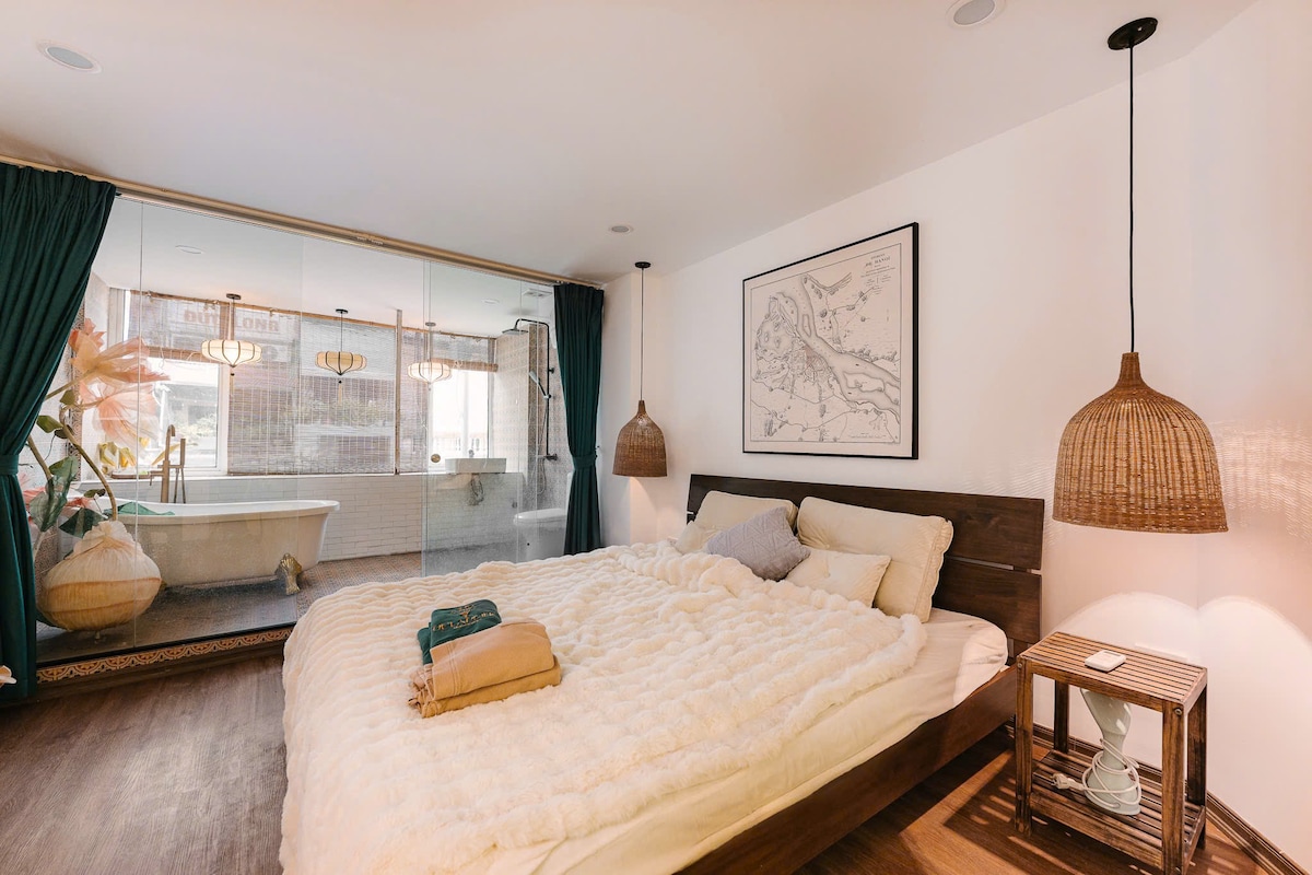 Step into this peaceful 75m² retreat in the heart of Hanoi: a 2-bedroom "oasis" complete with a mini fish pond on the balcony and a relaxing wooden tub, where nature embraces your soul, just steps from Train Street.