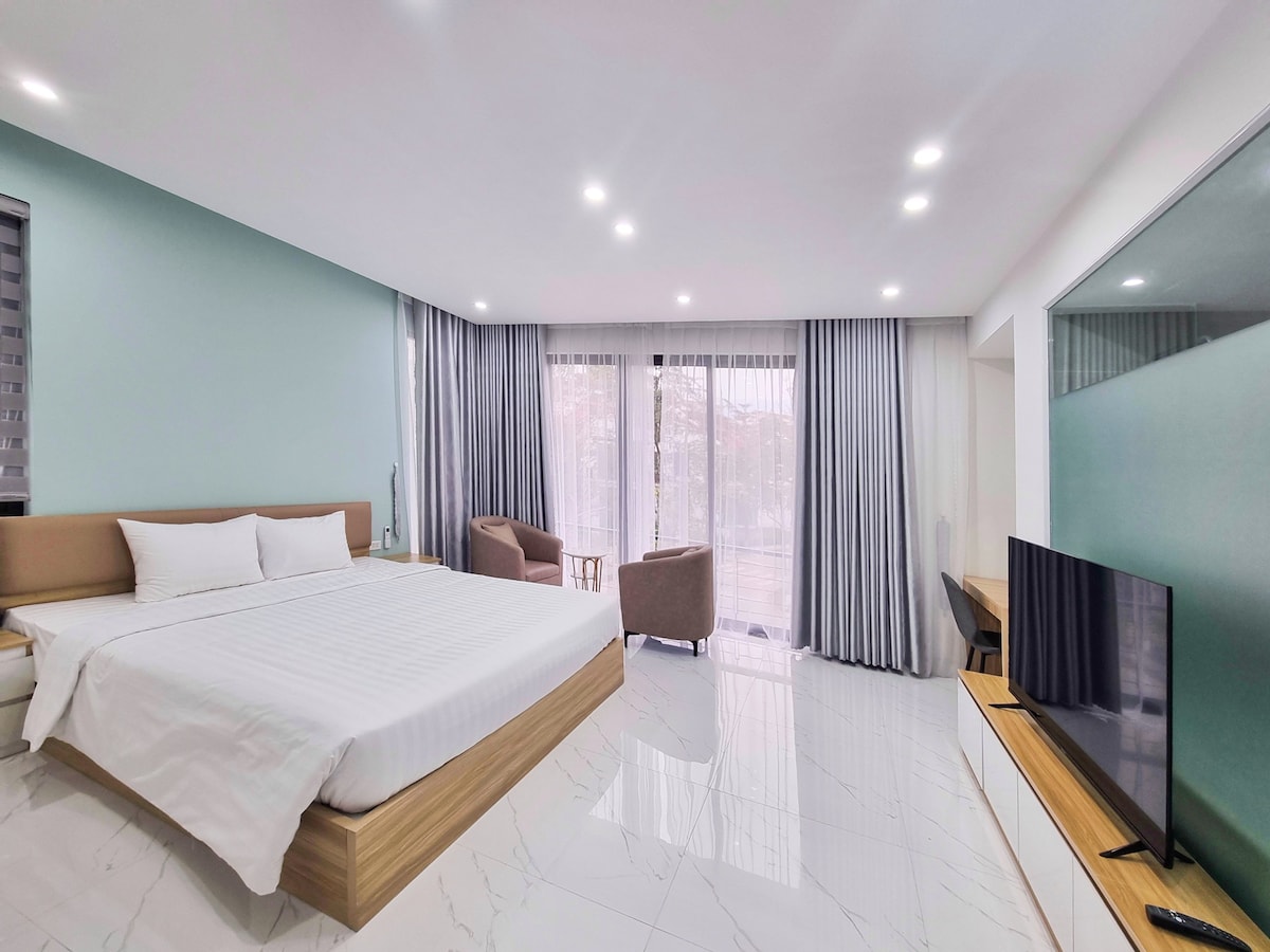 Skylark Garden House is located on Phan DInh Phung street and is only a few steps away from the night market. It is designed in a simple style, close to nature. In front of the door, many trees and flowers are planted to give customers an extremely relaxing feeling. The house is designed with 5 floors. The first floor is the living room and kitchen area. The 2nd, 3rd, 4th and 5th floors are bedrooms. Each bedroom is extremely neat and functional.
