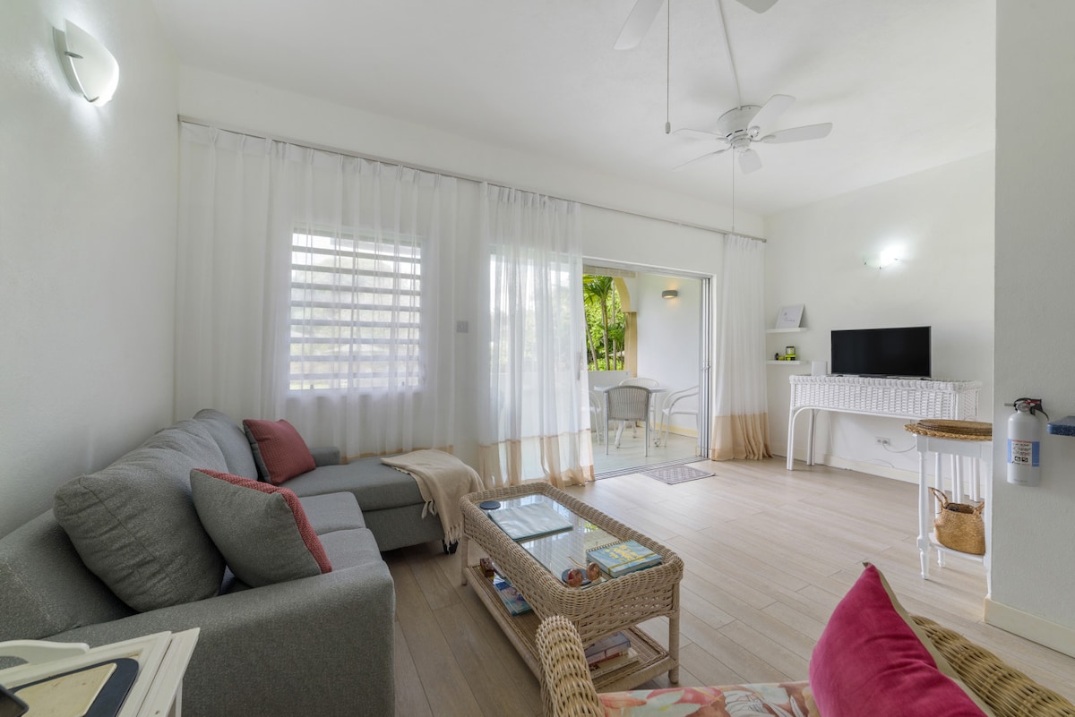 A luxurious, spacious one bedroom apartment, overlooking pasture and less than 5 minutes walk to glorious beaches. The owner lives downstairs to assist with any needs you may have. The property was built in 2018 and finished to a very high standard. The apartment throughout has vaulted ceilings with ceiling fans and porcelain tiles. The large balcony overlooks the garden and pasture beyond. Short walking distance to Limegrove duty free shops and cinema, supermarket, shops, restaurants and bars