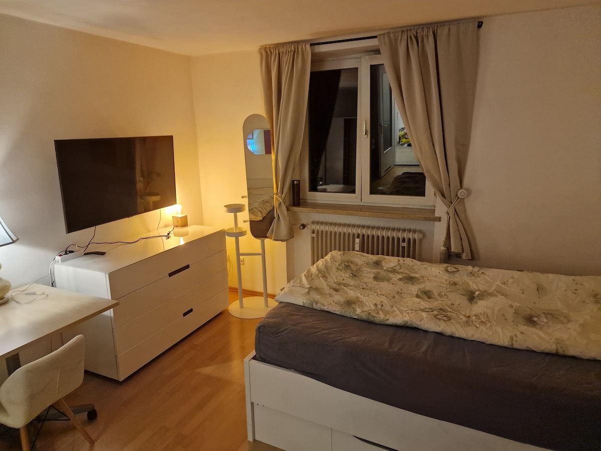 Das 16 Quadratmeter große Zimmer mit Bad ist in Haidhausen, einem belebten, kreativen Viertel im Münchner Zentrum. Wenige Meter entfernt sind Supermärkte, Bars und Restaurants. Du bist im EG mit separatem Eingang. Beim Betreten des Zimmers siehst du vor dir das helle Bad mit Dusche und WC, und eine Ecke mit Geschirr, Wasserkocher und Kühlschrank. Das Studio hat keine Küche. Links dann hohe Decken, ein hochwertiger Holzboden und grosse Fenster, dazu ein Schreibtisch und ein neues, richtiges Bett.