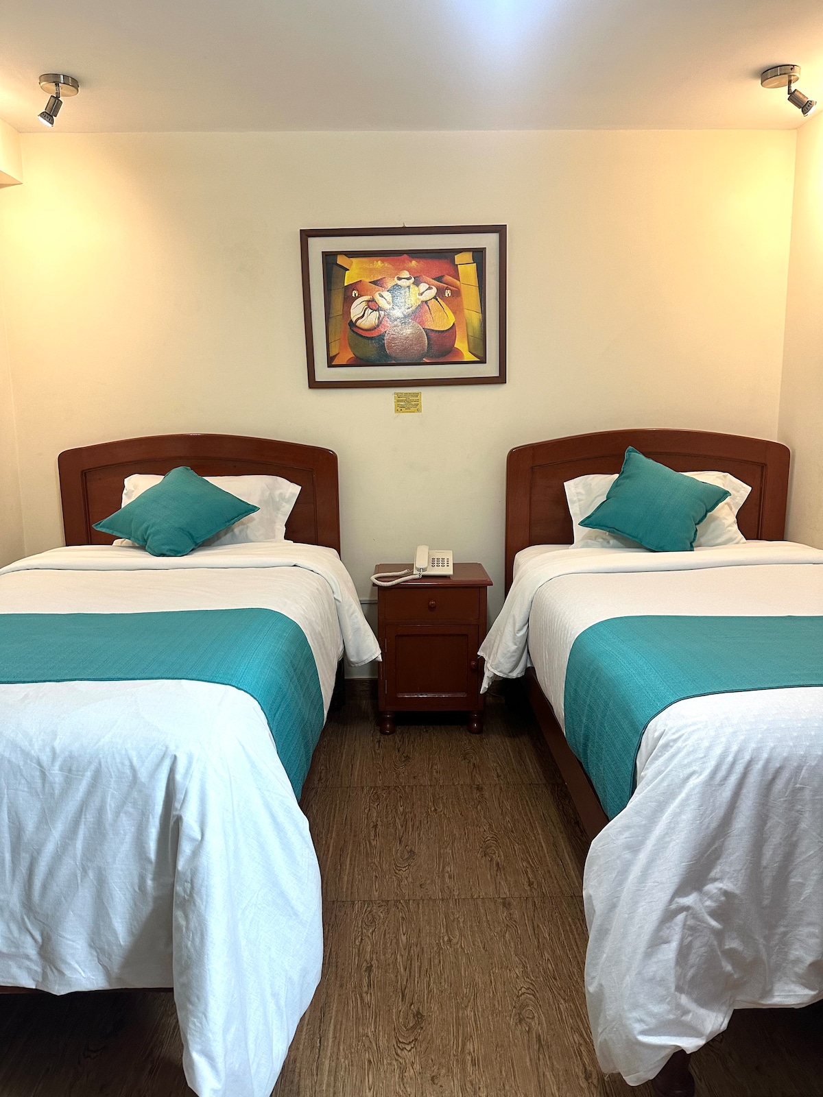 Habitación individual ubicada en Hotel tres estrellas en Trujillo. Cuenta con baño privado, agua caliente, wifi, tv cable, escritorio, closet, cortinas black out. Está incluido el servicio de desayuno americano en nuestra cafetería. Nuestro hotel cuenta con estacionamiento privado, ascensor, guardaequipaje y atención las 24 horas. Estamos ubicados a 2 cuadras de la Av. España. A solo 5 cuadras de la Plaza de armas de Trujillo.